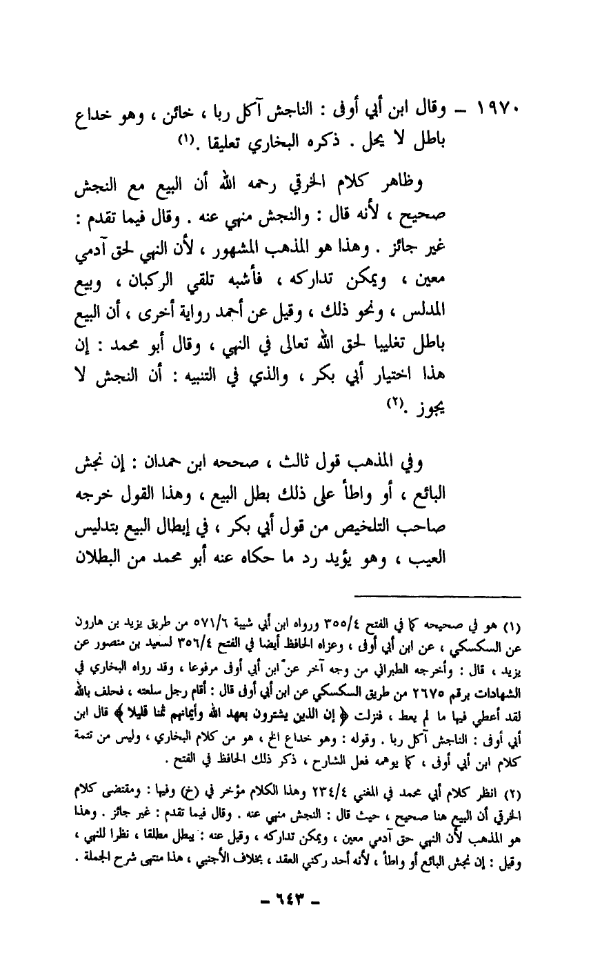 1970 - وقال ابن أبي أوفى: الناجش آكل ربا، خائن، وهو خداع باطل لا يحل. ذكره البخاري تعليقا.