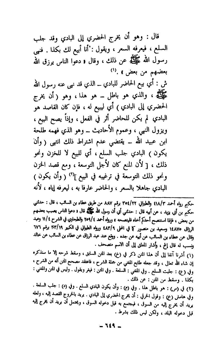 ش: أي بيع الحاضر للبادي - الذي قد نهى عنه رسول الله - صَلَّى اللَّهُ عَلَيْهِ وَسَلَّمَ -، والذي هو باطل - هو هذا، وهو (أن يخرج الحضري إلى البادي) أي ليبيع له، فإن كان القاصد هو البادي لم يكن للحاضر أثر في الفعل، وإذا يصح البيع، ويزول النهي، وعموم الأحاديث - وهو الذي فهمه طلحة ابن عبيد الله - يقتضي عدم اشتراط ذلك، انتهى. (وأن يكون) البادي جلب السلع، أي للبيع لا للخزن ونحو ذلك، [لأن المنع كان لأجل التوسعة، ومع قصد الخزن ونحو ذلك التوسعة في ترغيبه في البيع] . (وأن يكون) البادي جاهلا بالسعر، والحاضر عارفا به، ليعرفه إياه، لأنه