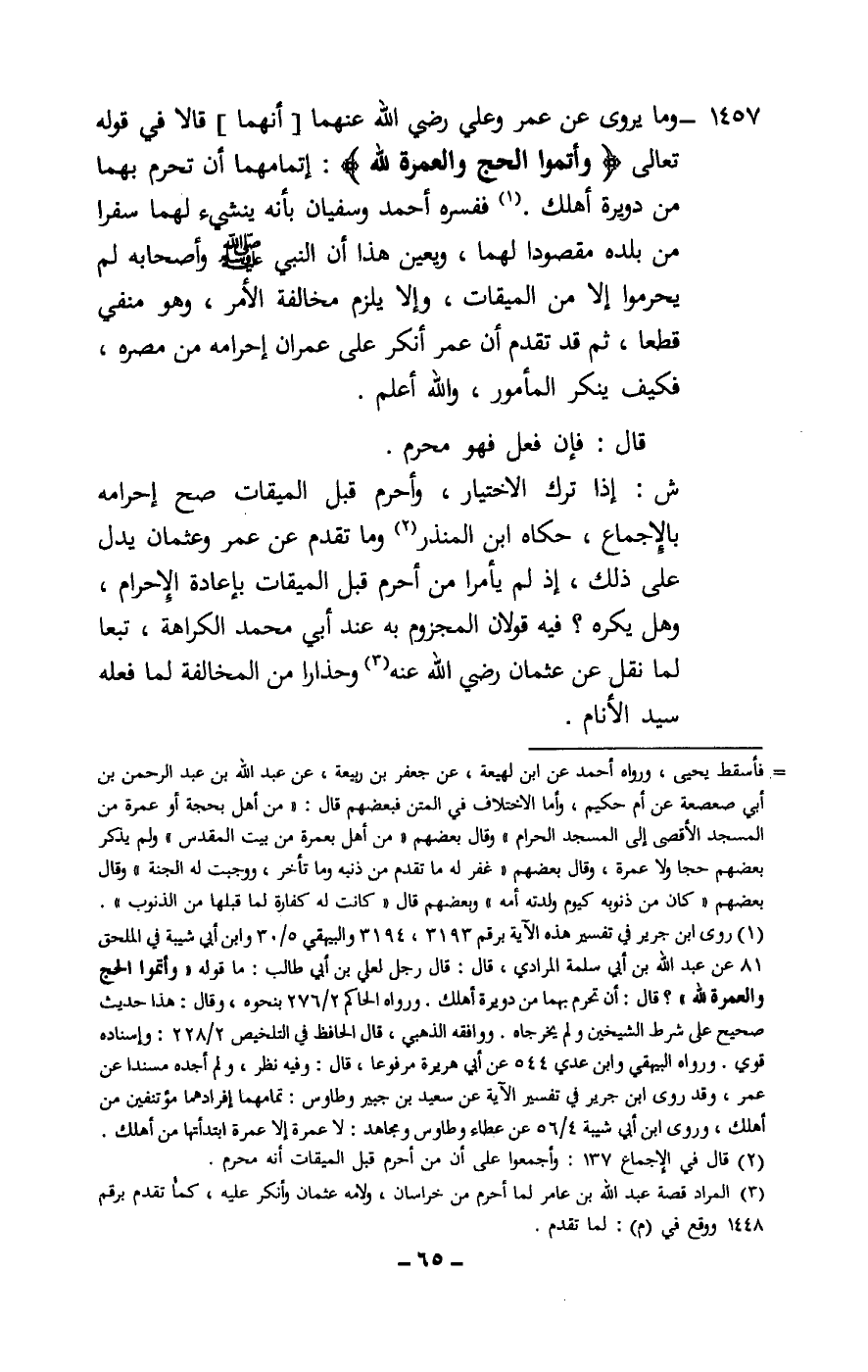1457 - وما يروى عن عمر، وعلي - رَضِيَ اللَّهُ عَنْهُمَا -[أنهما] قالا في قَوْله تَعَالَى {وَأَتِمُّوا الْحَجَّ وَالْعُمْرَةَ لِلَّهِ} [البقرة: 196] : إتمامهما أن تحرم بهما من دويرة أهلك. ففسره أحمد وسفيان بأنه ينشئ لهما سفرا من بلده مقصودا لهما، ويعين هذا أن النبي - صَلَّى اللَّهُ عَلَيْهِ وَسَلَّمَ - وأصحابه لم يحرموا إلا من الميقات، وإلا يلزم مخالفة الأمر، وهو منفي قطعا، ثم قد تقدم أن عمر أنكر على عمران إحرامه من مصره، فكيف ينكر المأمور، والله أعلم.