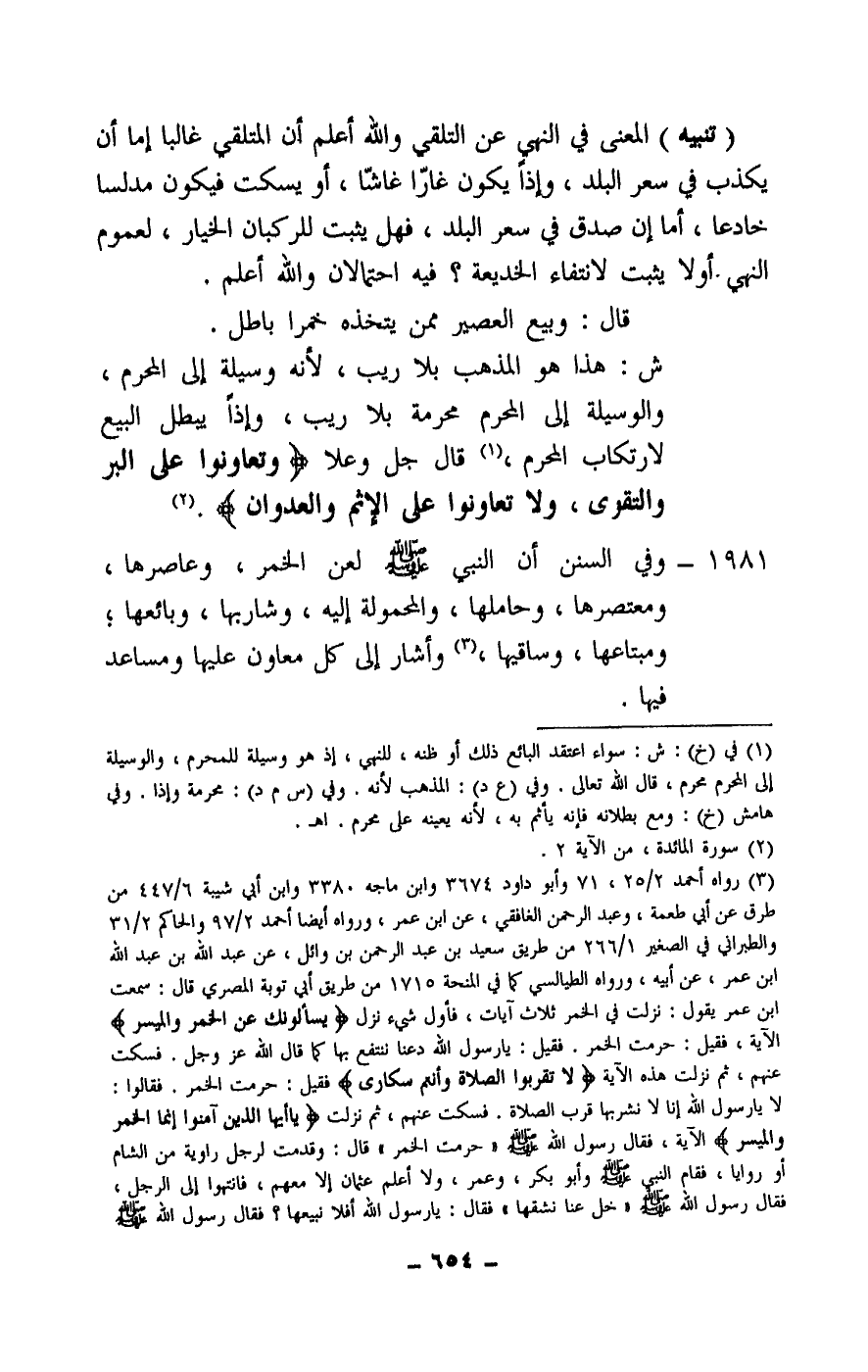 1981 - وفي السنن «أن النبي - صَلَّى اللَّهُ عَلَيْهِ وَسَلَّمَ - لعن الخمر، وعاصرها، ومعتصرها، وحاملها، والمحمولة إليه، وشاربها، وبائعها، ومبتاعها، وساقيها» وأشار إلى كل معاون عليها ومساعد فيها.