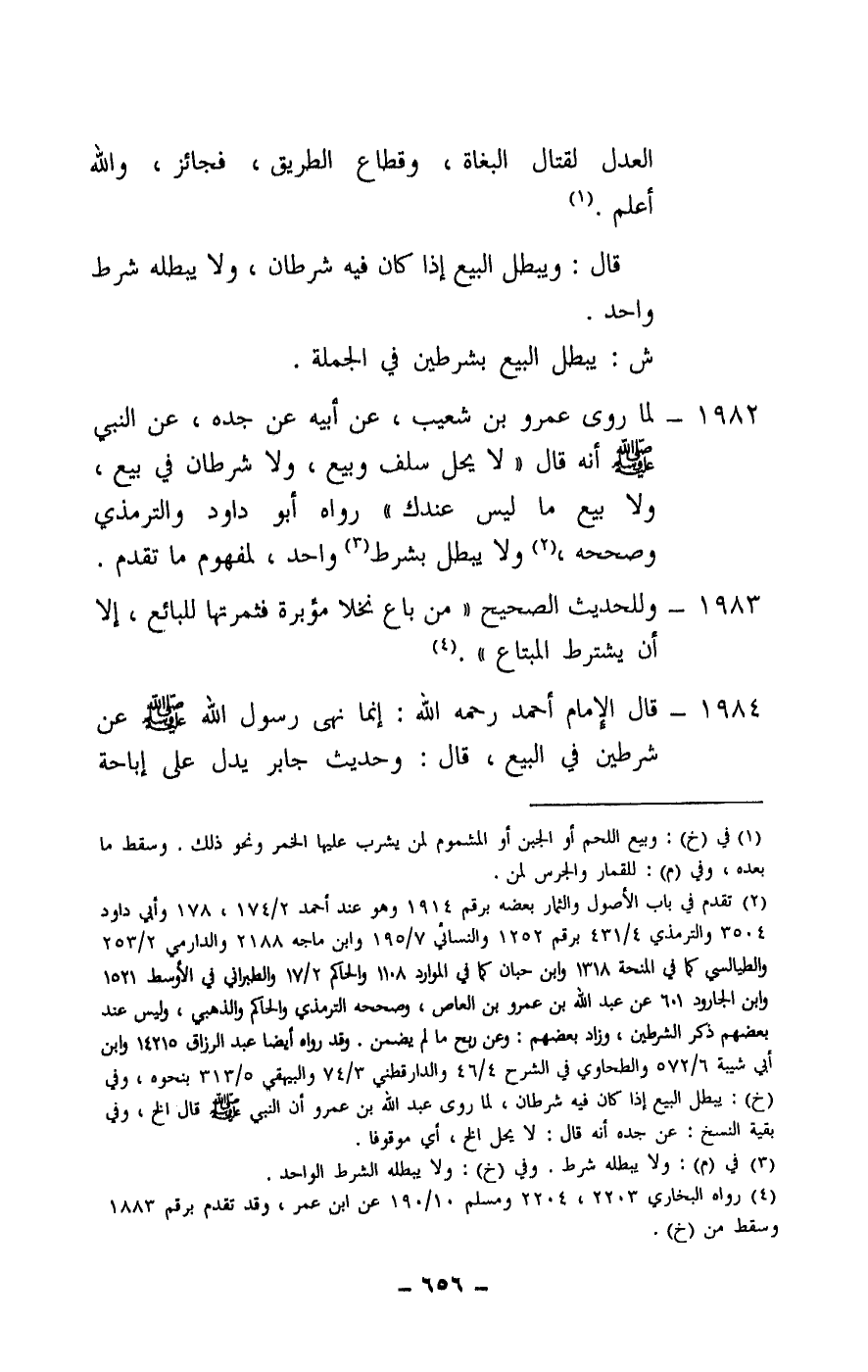 1984 - قال الإمام أحمد - رَحِمَهُ اللَّهُ -: إنما نهى رسول الله - صَلَّى اللَّهُ عَلَيْهِ وَسَلَّمَ - عن شرطين في البيع، قال: وحديث جابر يدل على إباحة