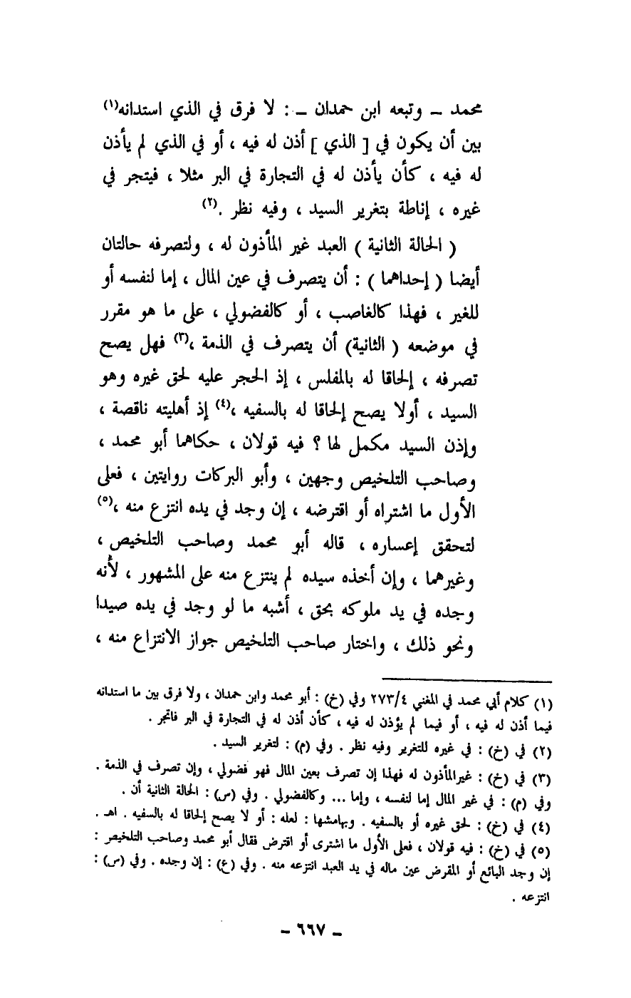 (الحالة الثانية) العبد غير المأذون له، ولتصرفه حالتان أيضا: (إحداهما) : أن يتصرف في عين المال، إما لنفسه أو للغير، فهذا كالغاصب، أو كالفضولي، على ما هو مقرر في موضعه (الثانية) أن يتصرف في الذمة، فهل يصح تصرفه، إلحاقا له بالمفلس، إذ الحجر عليه لحق غيره وهو السيد، أو لا يصح إلحاقا له بالسفيه، إذ أهليته ناقصة، وإذن السيد مكمل لها؟ فيه قولان، حكاهما أبو محمد، وصاحب التلخيص وجهين، وأبو البركات روايتين، فعلى الأول ما اشتراه أو اقترضه، إن وجد في يده انتزع منه، لتحقق إعساره، قاله أبو محمد وصاحب التلخيص، وغيرهما، وإن أخذه سيده لم ينتزع منه على المشهور، لأنه وجده في يد مملوكه بحق، أشبه ما لو وجد في يده صيدا ونحو ذلك، واختار صاحب التلخيص جواز الانتزاع منه،