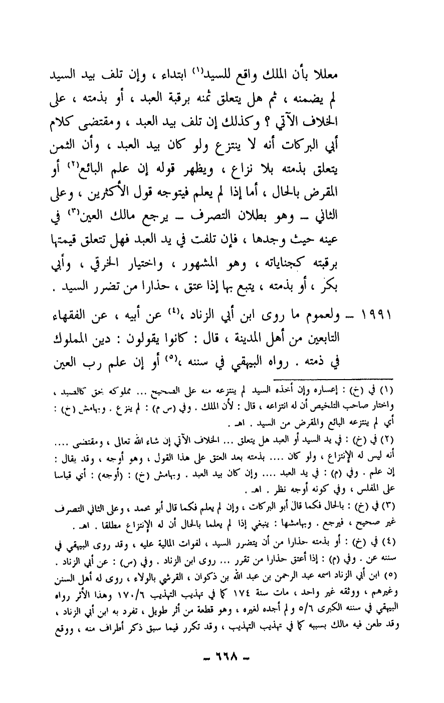 1991 - ولعموم ما روى ابن أبي الزناد، عن أبيه، عن الفقهاء التابعين من أهل المدينة، قال: كانوا يقولون: دين المملوك في ذمته. رواه البيهقي في سننه، أو إن علم رب العين
