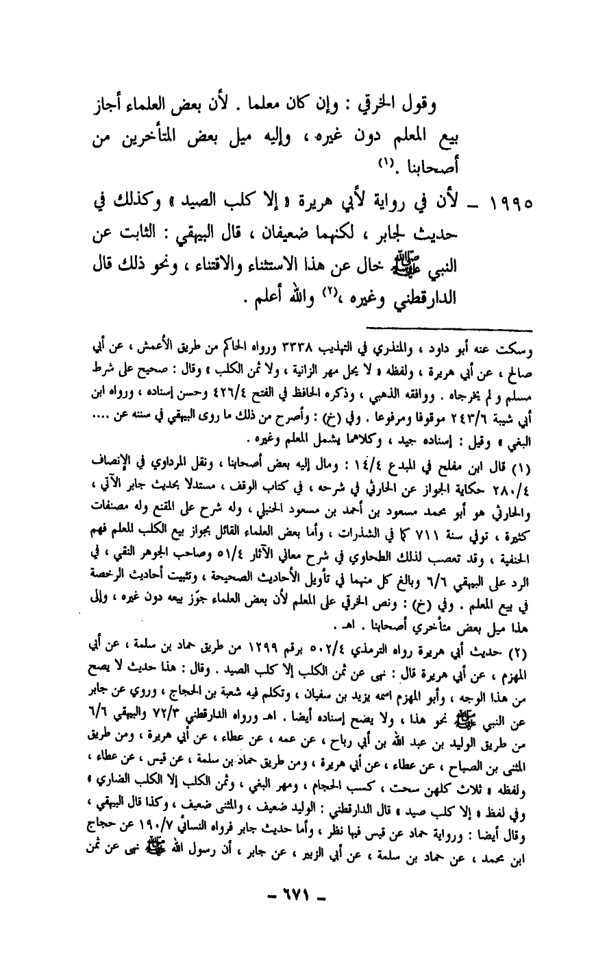 1995 - لأن في رواية لأبي هريرة إلا كلب الصيد وكذلك في حديث لجابر، لكنهما ضعيفان، قال البيهقي: الثابت عن النبي - صَلَّى اللَّهُ عَلَيْهِ وَسَلَّمَ - خال من هذا الاستثناء والاقتناء، ونحو ذلك قال الدارقطني وغيره، والله أعلم.