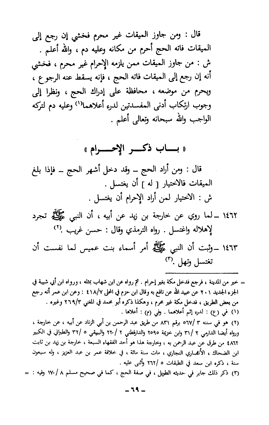 1462 - لما روي عن خارجة بن زيد عن أبيه، «أن النبي - صَلَّى اللَّهُ عَلَيْهِ وَسَلَّمَ - تجرد لإهلاله واغتسل» . رواه الترمذي وقال: حسن غريب.