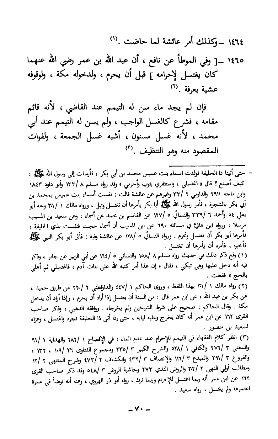 1465 -[وفي الموطأ عن نافع، أن عبد الله بن عمر - رَضِيَ اللَّهُ عَنْهُمَا - كان يغتسل لإحرامه] قبل أن يحرم، ولدخوله مكة، ولوقوفه عشية بعرفة.