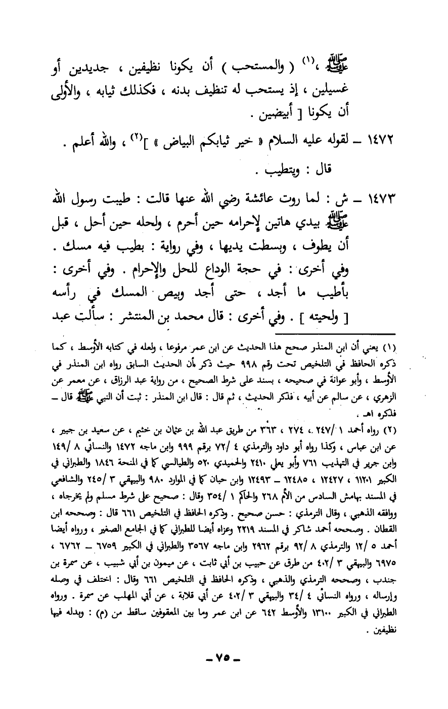 1473 - ش: لما «روت عائشة - رَضِيَ اللَّهُ عَنْهَا - قالت: طيبت رسول الله - صَلَّى اللَّهُ عَلَيْهِ وَسَلَّمَ - بيدي هاتين لإحرامه حين أحرم، ولحله حين أحل، قبل أن يطوف، وبسطت يديها، وفي رواية: بطيب فيه مسك. وفي أخرى: في حجة الوداع للحل والإحرام. وفي أخرى: بأطيب ما أجد، حتى أجد وبيص المسك في رأسه [ولحيته] » . وفي أخرى: «قال محمد بن المنتشر: سألت