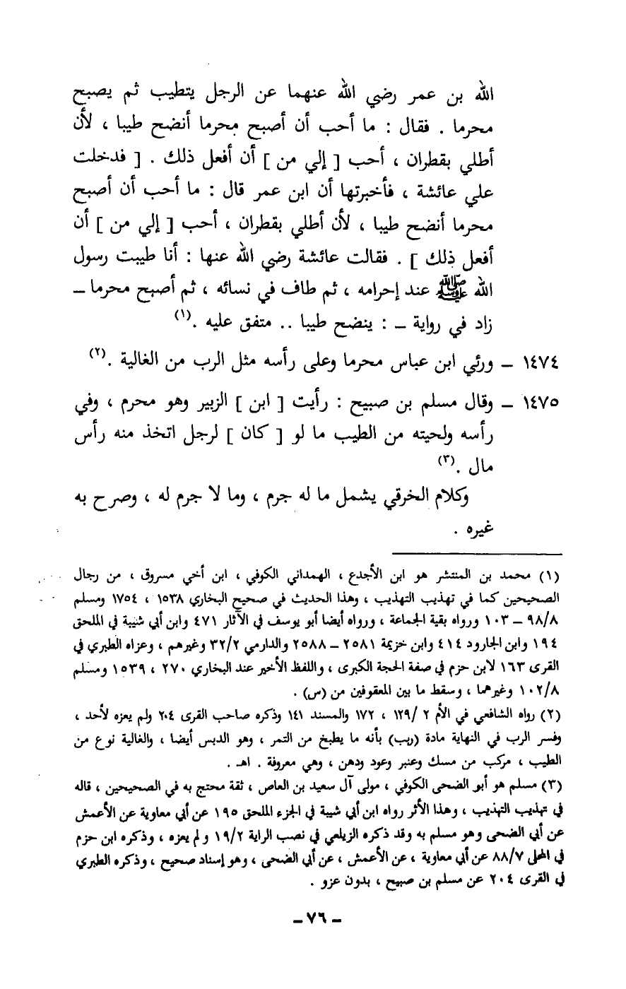 1475 - وقال مسلم بن صبيح: رأيت [ابن] الزبير وهو محرم، وفي رأسه ولحيته من الطيب ما لو [كان] لرجل اتخذ منه رأس مال.