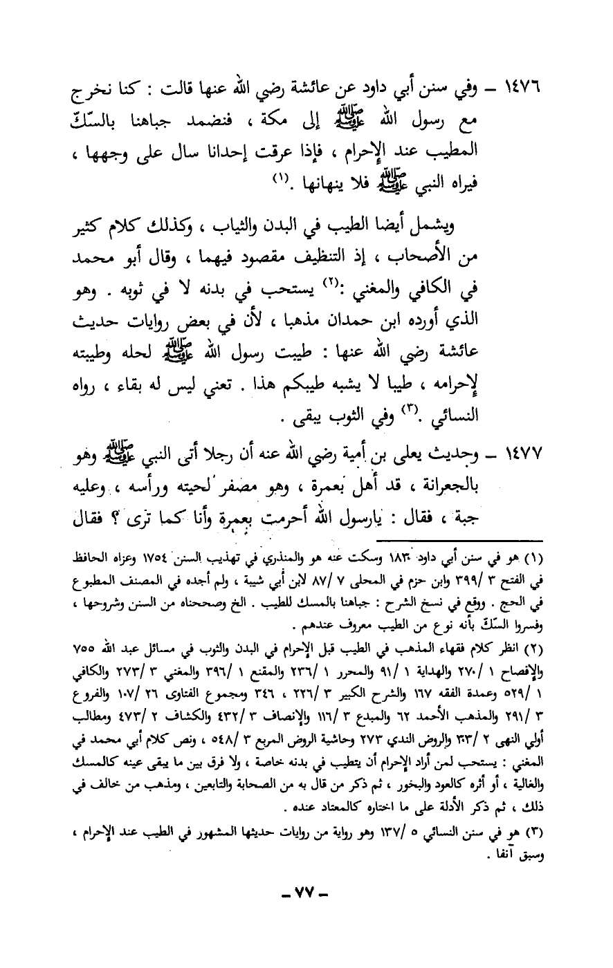 1476 - وفي سنن أبي داود «عن عائشة - رَضِيَ اللَّهُ عَنْهَا - قالت: كنا نخرج مع رسول الله - صَلَّى اللَّهُ عَلَيْهِ وَسَلَّمَ - إلى مكة، فنضمد جباهنا بالسك المطيب عند الإحرام، فإذا عرقت إحدانا سال على وجهها، فيراه النبي - صَلَّى اللَّهُ عَلَيْهِ وَسَلَّمَ - فلا ينهانها.»