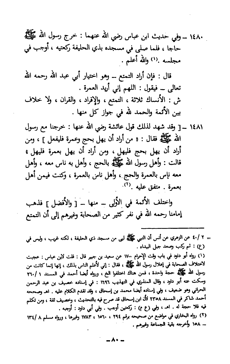 1480 - وفي حديث ابن عباس - رَضِيَ اللَّهُ عَنْهُمَا -: «خرج رسول الله - صَلَّى اللَّهُ عَلَيْهِ وَسَلَّمَ - حاجا، فلما صلى في مسجده بذي الحليفة ركعتيه، أوجب في مجلسه» . والله أعلم.