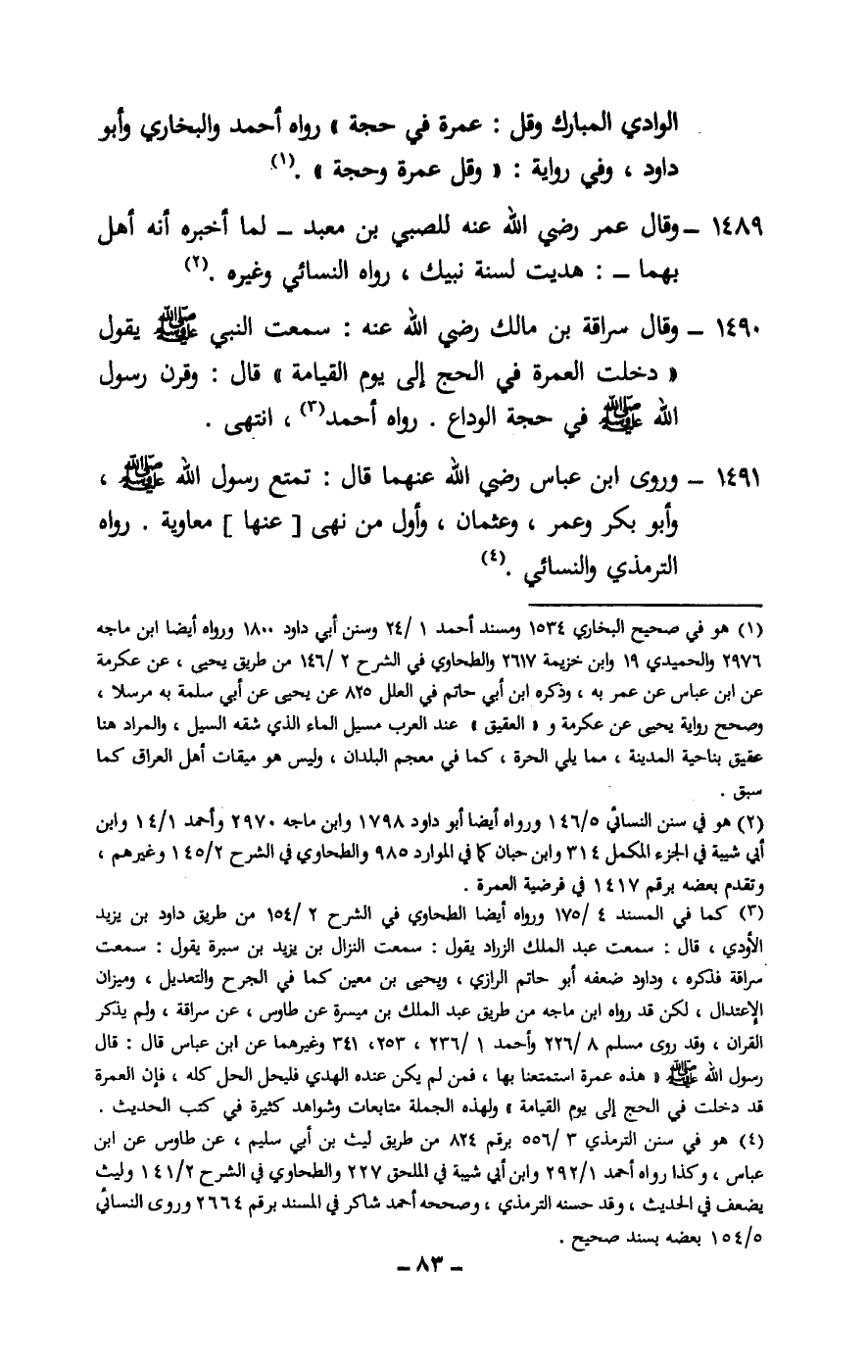 1490 - «وقال سراقة بن مالك - رَضِيَ اللَّهُ عَنْهُ -: سمعت النبي - صَلَّى اللَّهُ عَلَيْهِ وَسَلَّمَ - يقول «دخلت العمرة في الحج إلى يوم القيامة» قال: وقرن رسول الله - صَلَّى اللَّهُ عَلَيْهِ وَسَلَّمَ - في حجة الوداع» . رواه أحمد، انتهى.