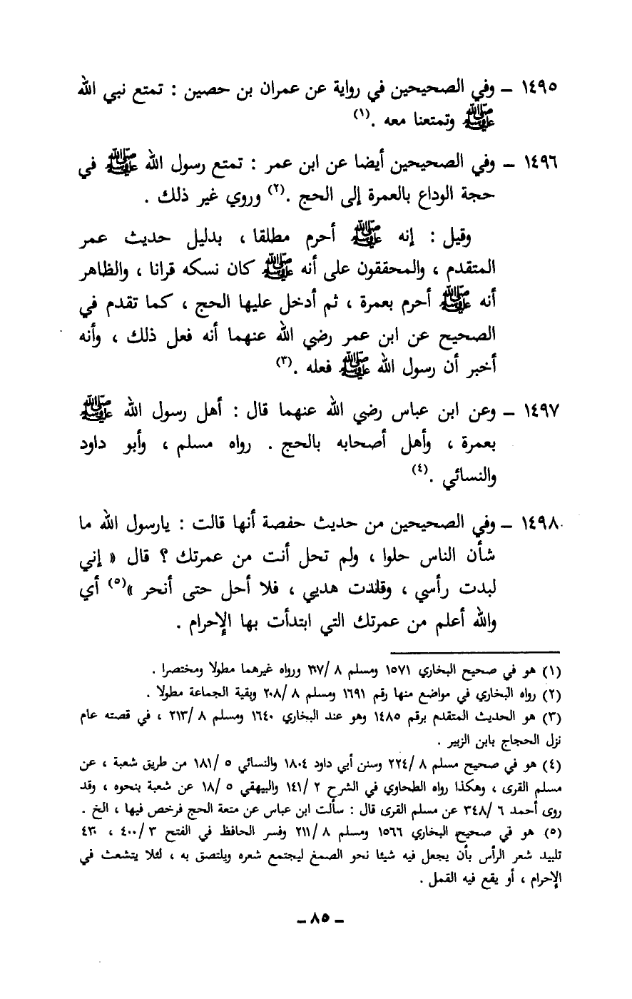 1496 - وفي الصحيحين أيضا عن ابن عمر: «تمتع رسول الله - صَلَّى اللَّهُ عَلَيْهِ وَسَلَّمَ - في حجة الوداع بالعمرة إلى الحج» ، وروي غير ذلك.