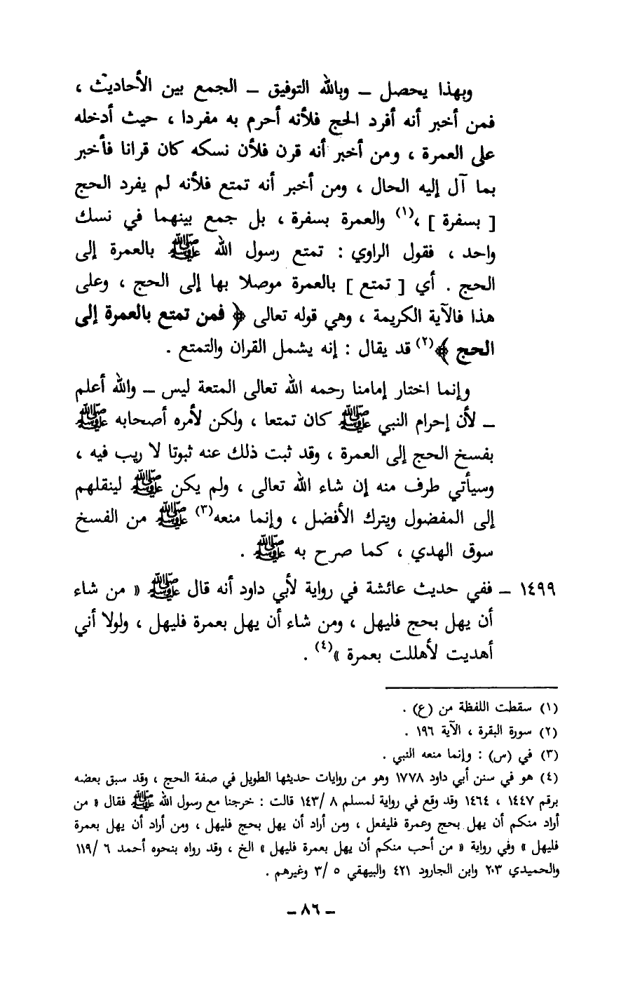 1499 - ففي حديث عائشة في رواية لأبي داود أنه قال - صَلَّى اللَّهُ عَلَيْهِ وَسَلَّمَ -: «من شاء أن يهل بحج فليهل، ومن شاء أن يهل بعمرة فليهل، ولولا أني أهديت لأهللت بعمرة» .