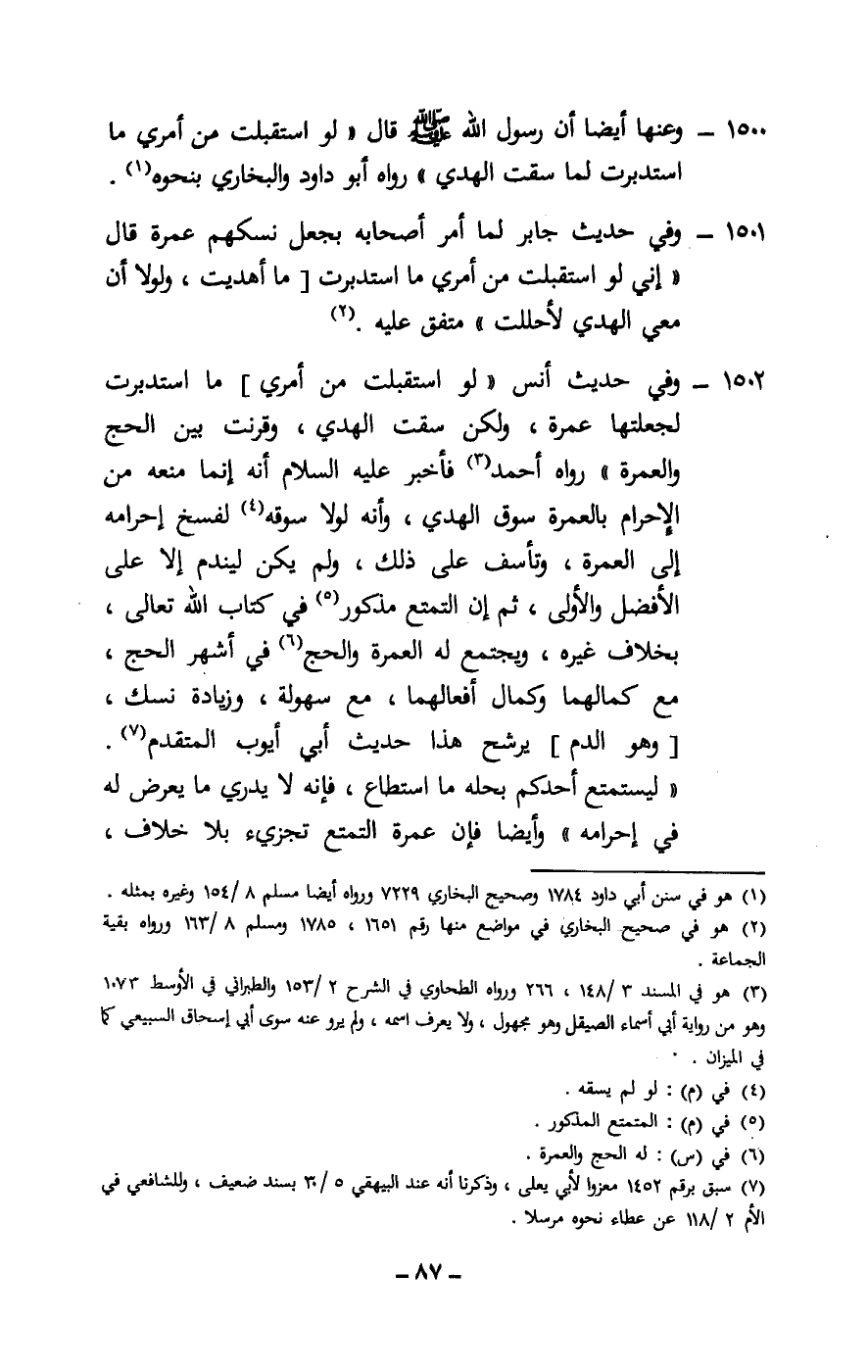 1502 - وفي حديث أنس «لو استقبلت من أمري] ما استدبرت لجعلتها عمرة، ولكن سقت الهدي، وقرنت بين الحج والعمرة» رواه أحمد فأخبر - عَلَيْهِ السَّلَامُ - أنه إنما منعه من الإحرام بالعمرة سوق الهدي، وأنه لولا سوقه لفسخ إحرامه إلى العمرة، وتأسف على ذلك، ولم يكن ليندم إلا على الأفضل والأولى، ثم إن التمتع مذكور في كتاب الله تعالى، بخلاف غيره، ويجتمع له العمرة والحج في أشهر الحج، مع كمالهما وكمال أفعالهما، مع سهولة، وزيادة نسك، [وهو الدم] يرشح هذا حديث أبي أيوب المتقدم. «ليستمتع أحدكم بحله ما استطاع، فإنه لا يدري ما يعرض له في إحرامه» وأيضا فإن عمرة التمتع تجزئ بلا خلاف،