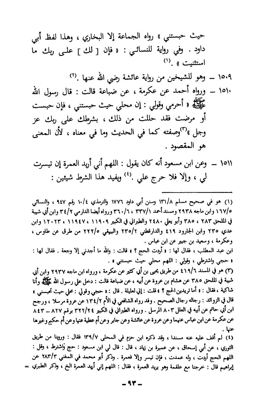 1511 - وعن ابن مسعود أنه كان يقول: اللهم إني أريد العمرة إن تيسرت لي، وإلا فلا حرج علي. ويفيد هذا الشرط شيئين: