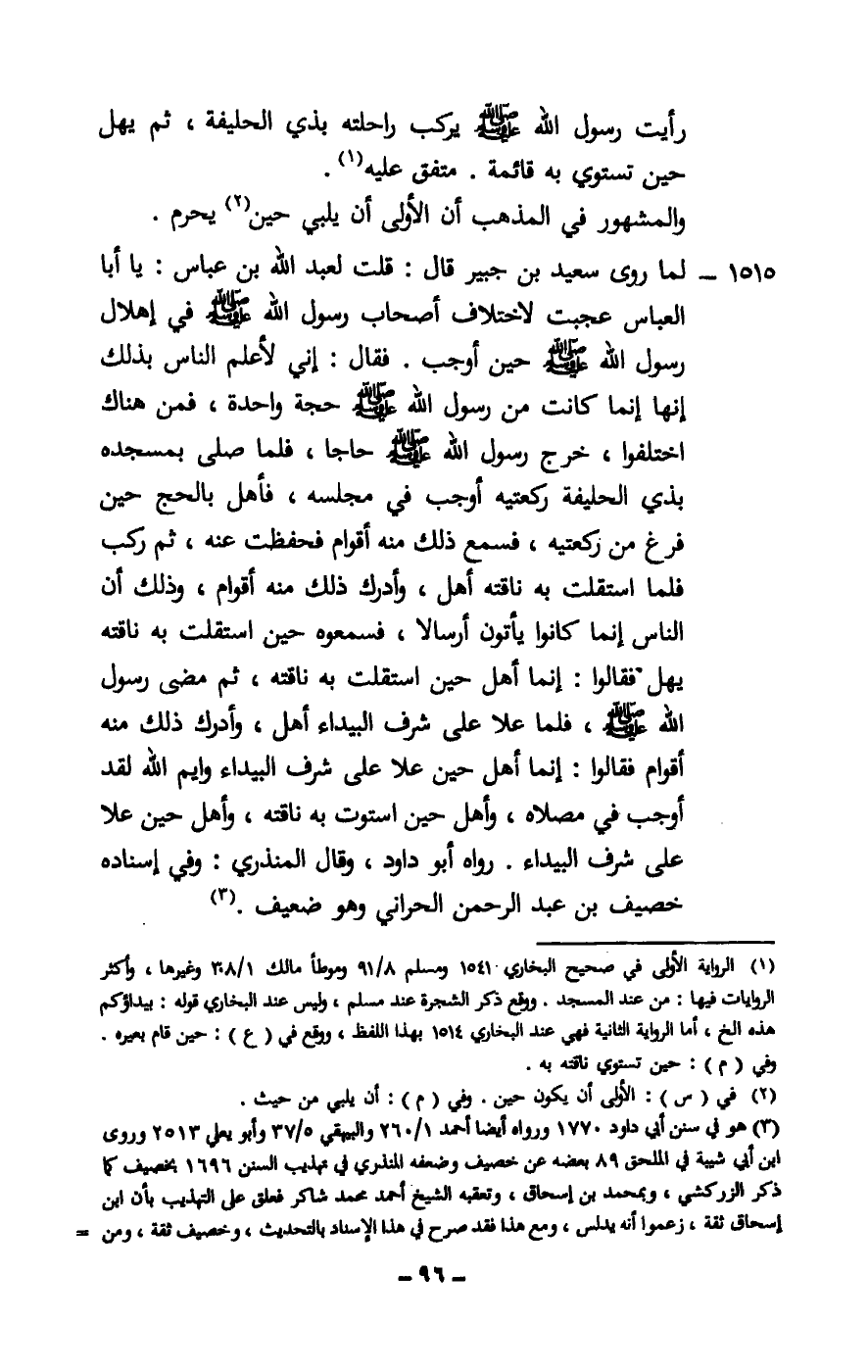 1515 - لما روى سعيد بن جبير قال: قلت لعبد الله بن عباس: يا أبا العباس عجبت لاختلاف أصحاب رسول الله - صَلَّى اللَّهُ عَلَيْهِ وَسَلَّمَ - في إهلال رسول الله - صَلَّى اللَّهُ عَلَيْهِ وَسَلَّمَ - حين أوجب. فقال: إني لأعلم الناس بذلك إنها إنما كانت من رسول الله - صَلَّى اللَّهُ عَلَيْهِ وَسَلَّمَ - حجة واحدة، فمن هناك اختلفوا، خرج رسول الله - صَلَّى اللَّهُ عَلَيْهِ وَسَلَّمَ - حاجا، فلما صلى بمسجده بذي الحليفة ركعتيه أوجب في مجلسه، فأهل بالحج حين فرغ من ركعتيه، فسمع ذلك منه أقوام فحفظت عنه، ثم ركب فلما استقلت به ناقته أهل، وأدرك ذلك منه أقوام، وذلك أن الناس إنما كانوا يأتون أرسالا، فسمعوه حين استقلت به ناقته يهل فقالوا: إنما أهل حين استقلت به ناقته، ثم مضى رسول الله - صَلَّى اللَّهُ عَلَيْهِ وَسَلَّمَ -، فلما علا على شرف البيداء أهل، وأدرك ذلك منه أقوام فقالوا: إنما أهل حين علا على شرف البيداء، وايم الله لقد أوجب في مصلاه، وأهل حين استوت به ناقته، وأهل حين علا على شرف البيداء. رواه أبو داود، وقال المنذري: وفي إسناده خصيف بن عبد الرحمن الحراني وهو ضعيف.