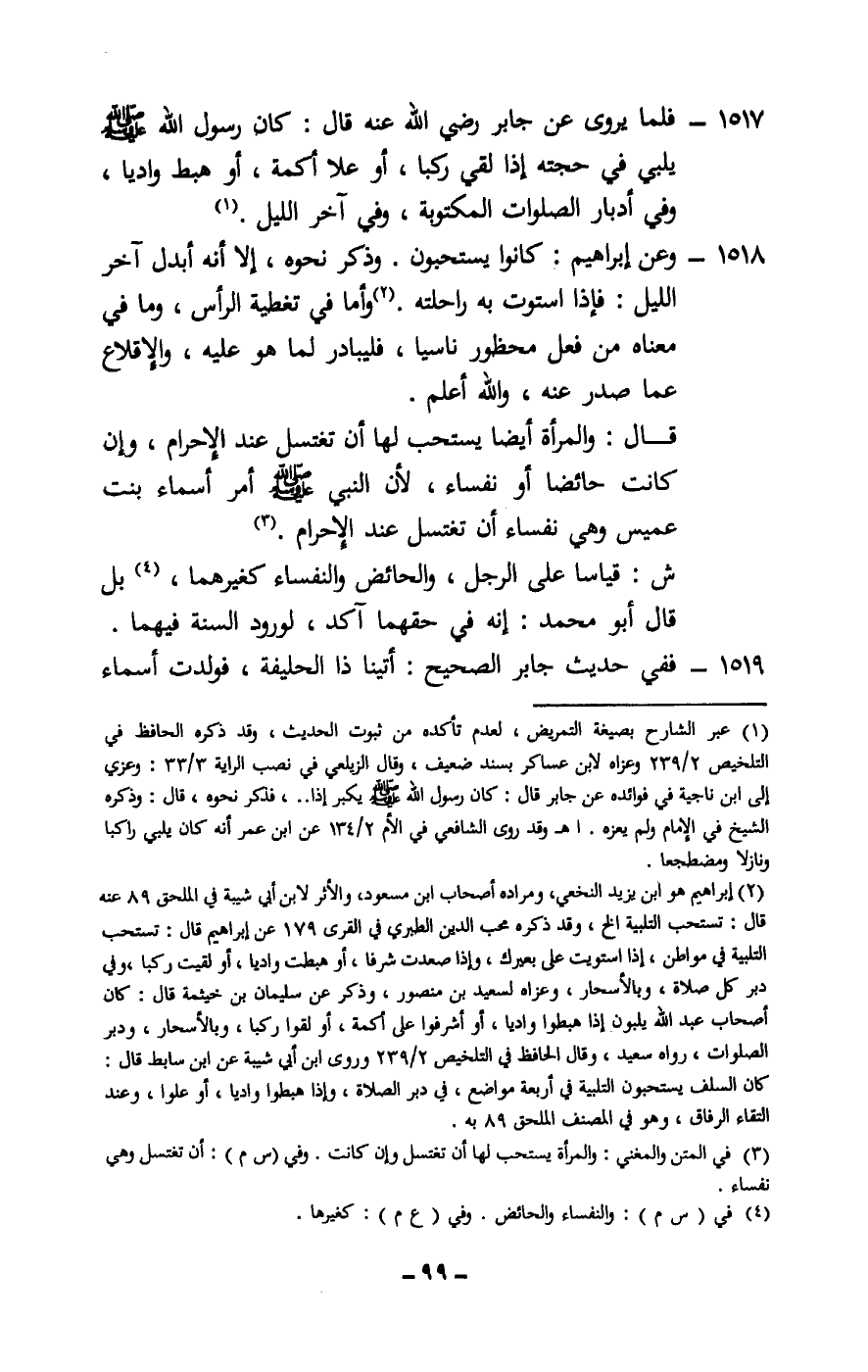 1517 - فلما يروى عن جابر - رَضِيَ اللَّهُ عَنْهُ - قال: «كان رسول الله - صَلَّى اللَّهُ عَلَيْهِ وَسَلَّمَ - يلبي في حجته إذا لقي ركبا، أو علا أكمة، أو هبط واديا، وفي أدبار الصلوات المكتوبة، وفي آخر الليل» .