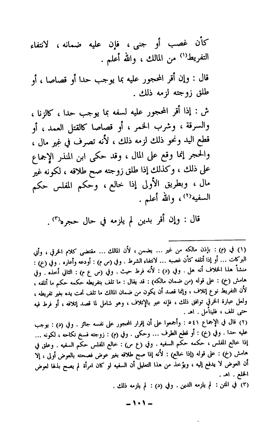 ش: إذا أقر المحجور عليه لسفه بما يوجب حدا، كالزنا، والسرقة، وشرب الخمر، أو قصاصا كالقتل العمد، أو قطع اليد ونحو ذلك لزمه ذلك، لأنه تصرف في غير مال، والحجر إنما وقع على المال، وقد حكى ابن المنذر الإجماع على ذلك، وكذلك إذا طلق زوجته صح طلاقه، لكونه غير مال، وبطريق الأولى إذا خالع، وحكم المفلس حكم السفيه، والله أعلم.