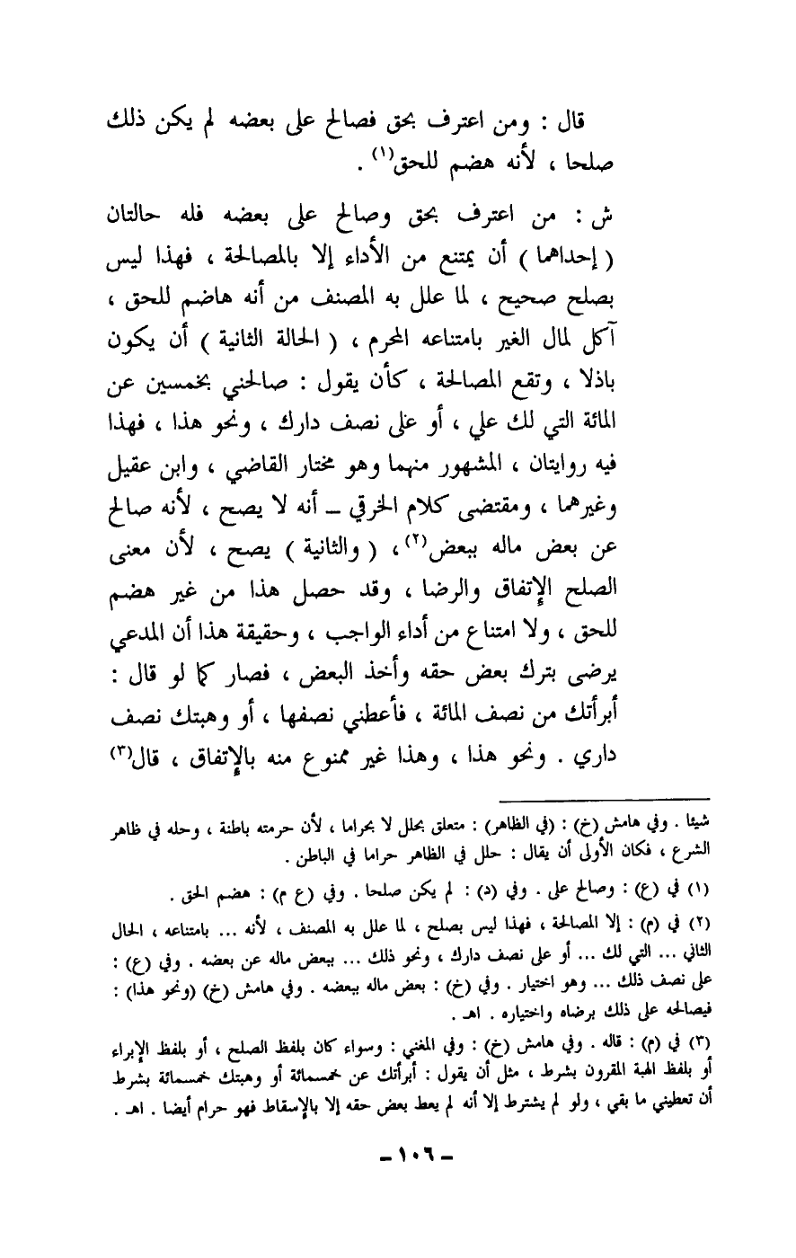 ش: من اعترف بحق وصالح على بعضه فله حالتان (إحداهما) أن يمتنع من الأداء إلا بالمصالحة، فهذا ليس بصلح صحيح، لما علل به المصنف من أنه هاضم للحق، آكل لمال الغير بامتناعه المحرم. (الحالة الثانية) أن يكون باذلا، وتقع المصالحة، كأن يقول: صالحني بخمسين عن المائة التي لك علي، أو على نصف دارك، ونحو هذا، فهل فيه روايتان، المشهور منهما وهو مختار القاضي، وابن عقيل وغيرهما، ومقتضى كلام الخرقي - أنه لا يصح، لأنه صالح عن بعض ماله ببعض، (والثانية) يصح، لأن معنى الصلح الاتفاق والرضا، وقد حصل هذا من غير هضم للحق، ولا امتناع من أداء الواجب، وحقيقة هذا أن المدعي يرضى بترك بعض حقه وأخذ البعض، فصار كما لو قال: أبرأتك من نصف المائة، فأعطني نصفها، أو وهبتك نصف داري. ونحو هذا، وهذا غير ممنوع منه بالاتفاق، قال