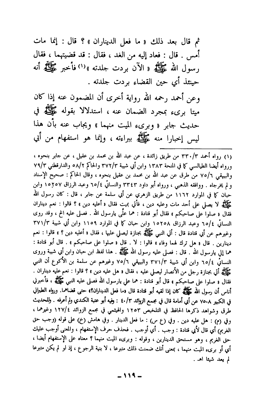 ثم قال بعد ذلك: «ما فعل الديناران» ؟ قال: إنما مات أمس. قال: فعاد إليه من الغد، فقال: قد قضيتهما، فقال رسول الله - صَلَّى اللَّهُ عَلَيْهِ وَسَلَّمَ -: «الآن بردت جلدته» فأخبر - صَلَّى اللَّهُ عَلَيْهِ وَسَلَّمَ - أنه حينئذ أي حين القضاء بردت جلدته.