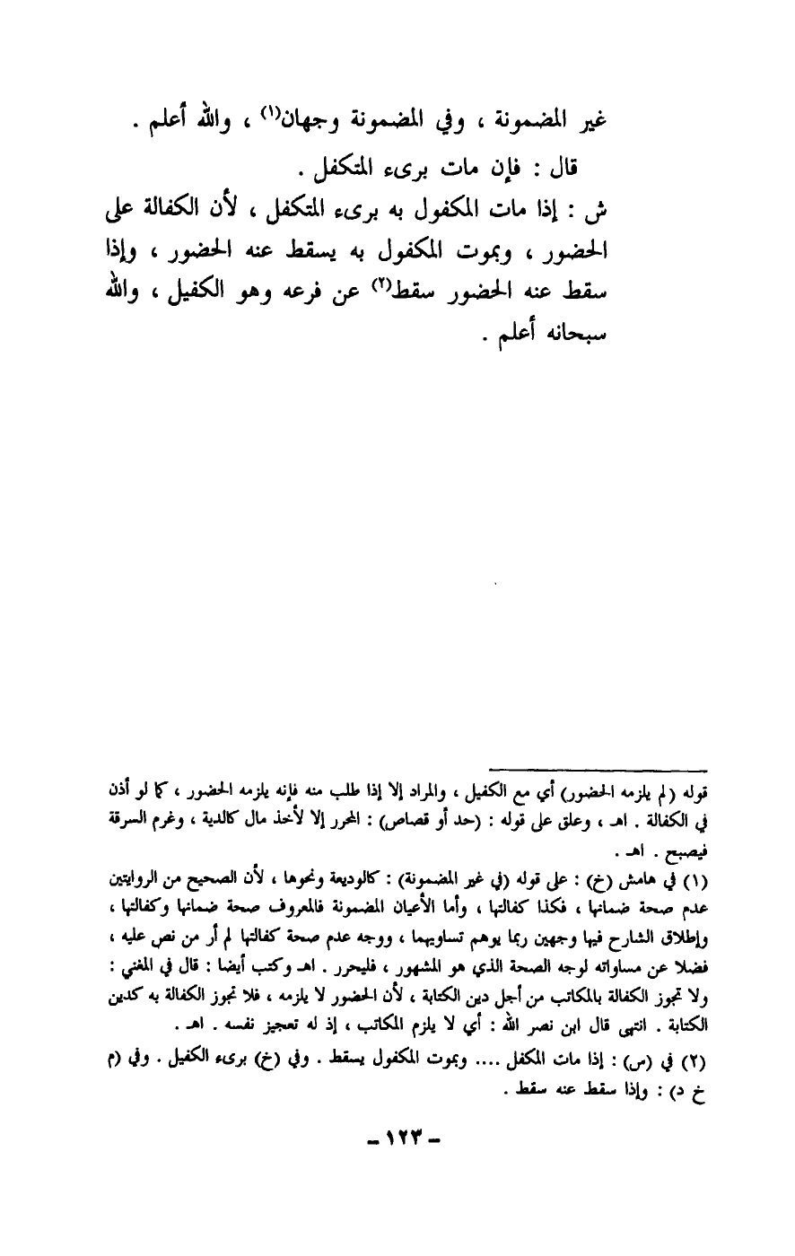 ش: إذا مات المكفول به برئ المتكفل، لأن الكفالة على الحضور، وبموت المكفول به يسقط عنه الحضور، وإذا سقط عنه الحضور سقط عن فرعه وهو الكفيل، والله سبحانه أعلم.