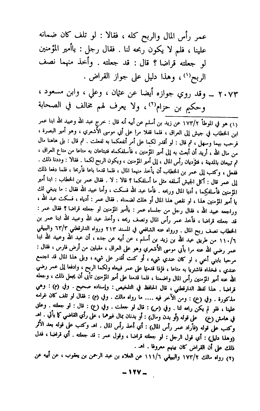 عمر رأس المال والربح كله، فقالا: لو تلف كان ضمانه علينا، فلم لا يكون ربحه لنا. فقال رجل: يا أمير المؤمنين لو جعلته قراضا؟ قال: قد جعلته. وأخذ منهما نصف الربح، وهذا دليل على جواز القراض.