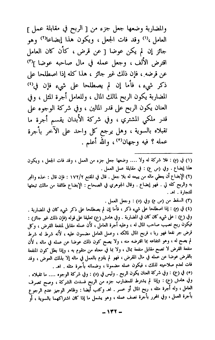 والمضاربة وضعها جعل جزء من [الربح في مقابلة عمل] العامل، وقد فات الجعل، ويكون هذا إبضاعا، وهو جائز إن لم يكن عوضا [عن قرض، كأن كان العامل اقترض الألف، وجعل عمله في مال صاحبه عوضا] عن قرضه، فإن ذلك غير جائز، هذا كله إذا اصطلحا على ذكر شيء، فأما إن لم يصطلحا على شيء، فإن في المضاربة يكون الربح لمالك المال، وللعامل أجرة المثل، وفي العنان: يكون الربح على قدر المالين، وفي شركة الوجوه: على قدر ملكي المشتري، وفي شركة الأبدان: يقسم أجرة ما تقبلاه بالسوية، وهل يرجع كل واحد على الآخر بأجرة عمله؟ فيه وجهان، والله أعلم.