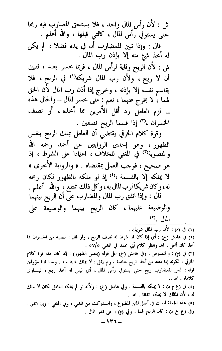 وقوة كلام الخرقي يقتضي أن العامل يملك الربح بنفس الظهور، وهو إحدى الروايتين عن أحمد - رَحِمَهُ اللَّهُ - والمنصوبة في المغني للخلاف، اعتمادا على الشرط، إذ هو صحيح، فوجب العمل بمقتضاه.