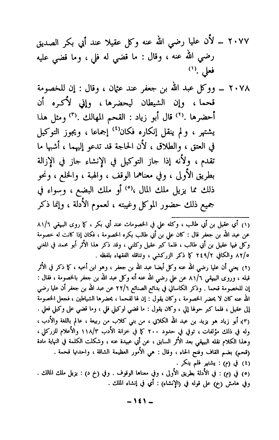 2077 - لأن عليا - رَضِيَ اللَّهُ عَنْهُ - وكل عقيلا عند أبي بكر الصديق - رَضِيَ اللَّهُ عَنْهُ -، وقال: ما قضي له فلي، وما قضي عليه فعلي.