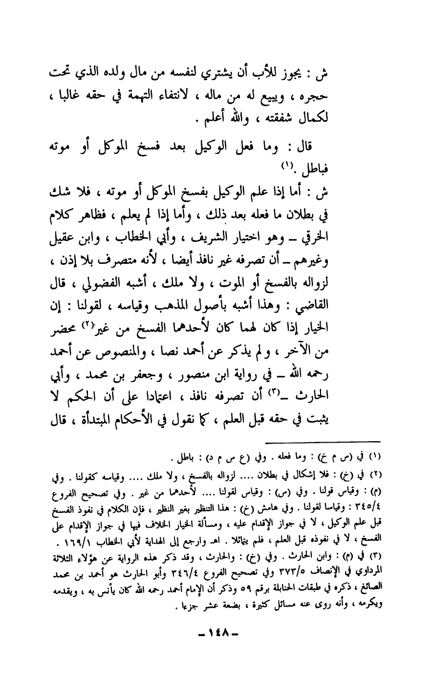 ش: أما إذا علم الوكيل بفسخ الموكل أو موته، فلا شك في بطلان ما فعله بعد ذلك، وأما إذا لم يعلم، فظاهر كلام الخرقي - وهو اختيار الشريف، وأبي الخطاب، وابن عقيل وغيرهم -: أن تصرفه غير نافذ أيضا، لأنه متصرف بلا إذن، لزواله بالفسخ أو الموت، ولا ملك، أشبه الفضولي.