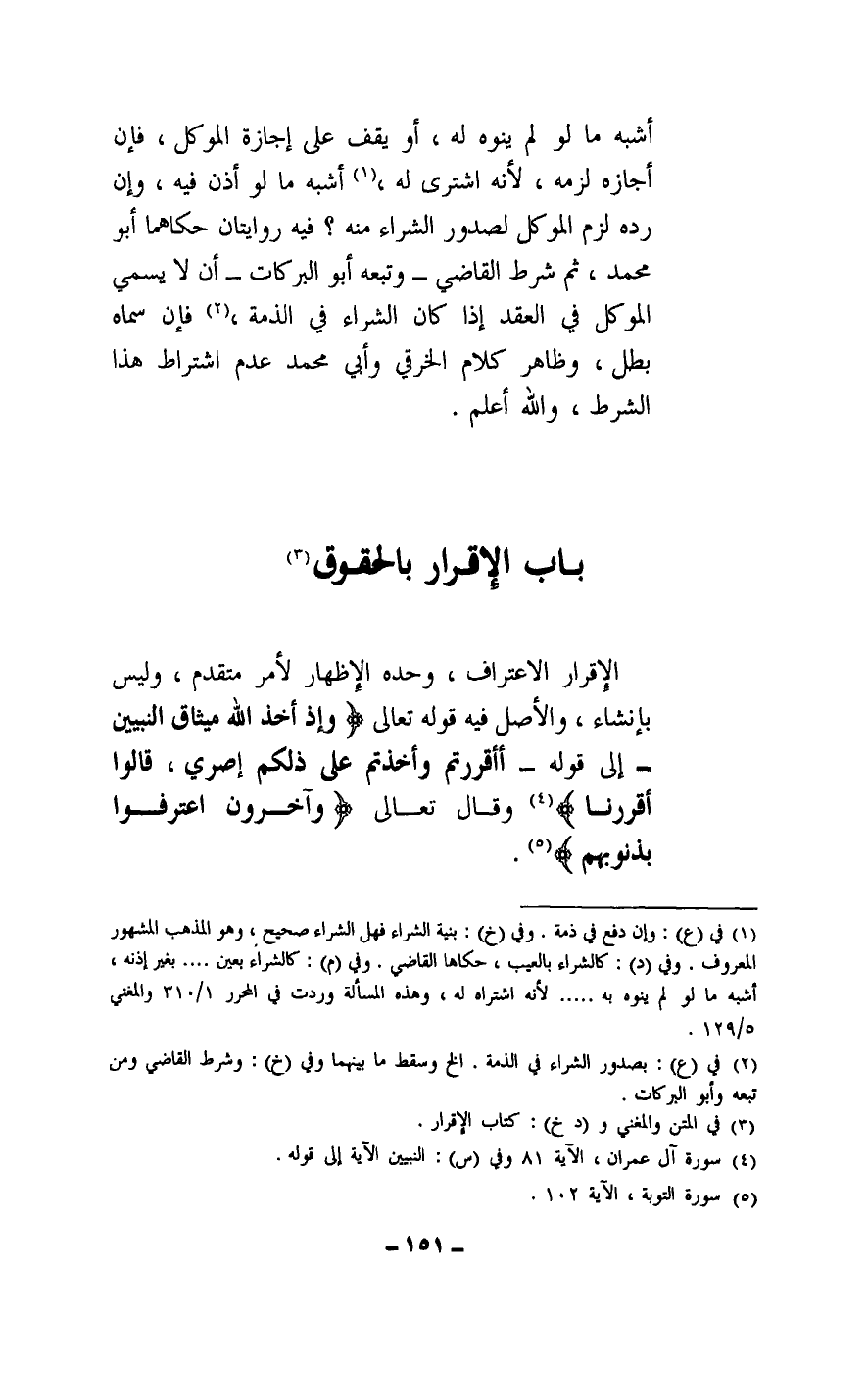 أشبه ما لو لم ينوه له، أو يقف على إجازة الموكل، فإن أجازه لزمه، لأنه اشترى له، أشبه ما لو أذن فيه، وإن رده لزم الموكل لصدور الشراء منه؟ فيه روايتان، حكاهما أبو محمد، ثم شرط القاضي - وتبعه أبو البركات - أن لا يسمي الموكل في العقد إذا كان الشراء في الذمة، فإن سماه بطل، وظاهر كلام الخرقي وأبي محمد عدم اشتراط هذا الشرط، والله أعلم.