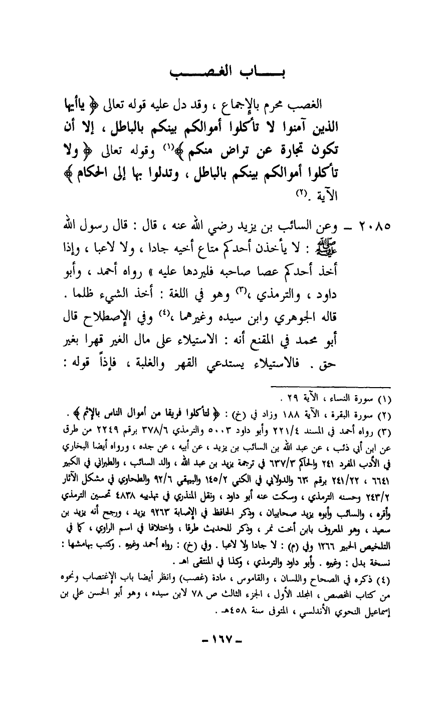 2085 - وعن السائب بن يزيد - رَضِيَ اللَّهُ عَنْهُ -، قال: قال رسول الله - صَلَّى اللَّهُ عَلَيْهِ وَسَلَّمَ -: «لا يأخذن أحدكم متاع أخيه جادا، ولا لاعبا، وإذا أخذ أحدكم عصا صاحبه فليردها عليه» . رواه أحمد، وأبو داود، والترمذي.