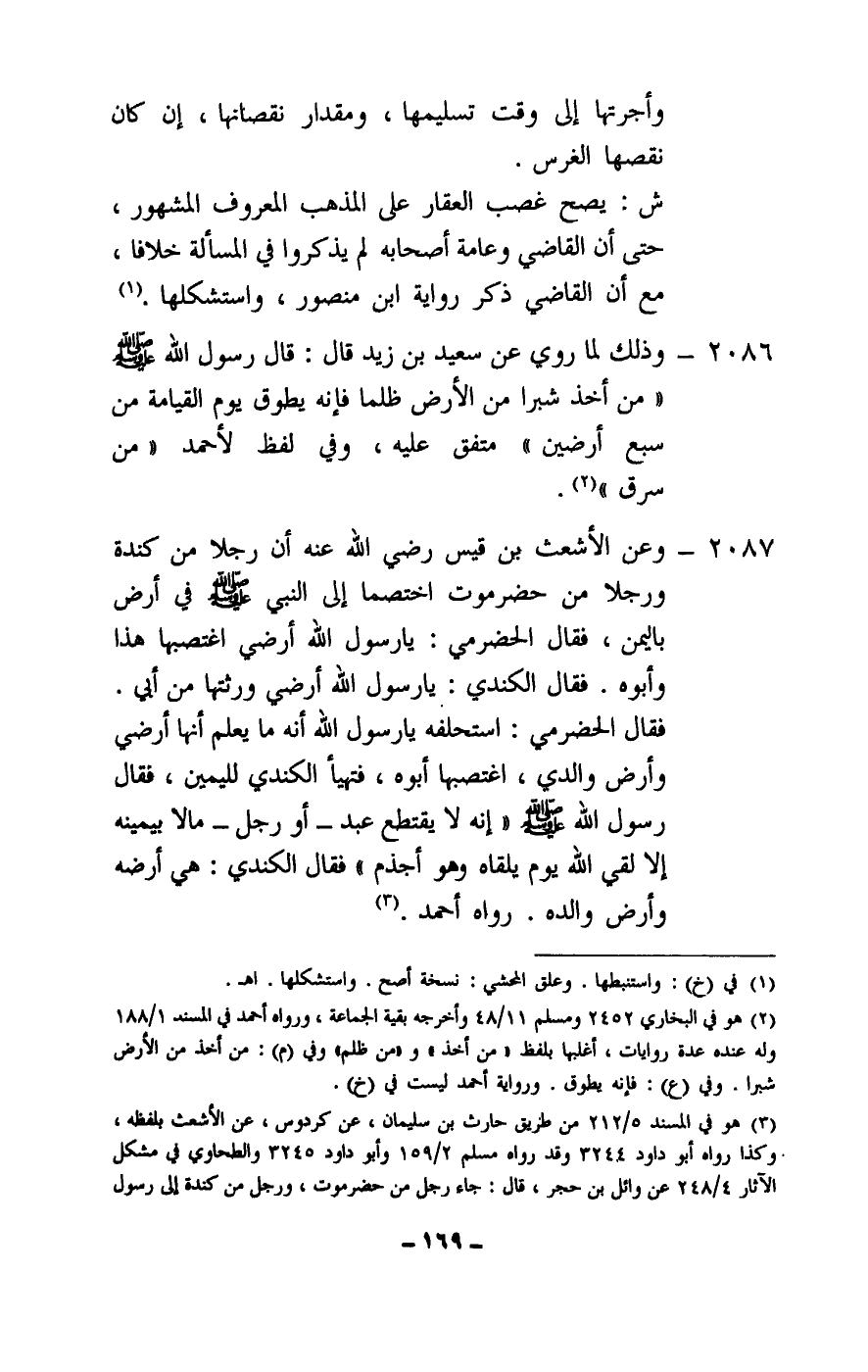 2086 - وذلك لما روي عن سعيد بن زيد قال: قال رسول الله - صَلَّى اللَّهُ عَلَيْهِ وَسَلَّمَ -: «من أخذ شبرا من الأرض ظلما فإنه يطوق يوم القيامة من سبع أرضين» . متفق عليه. وفي لفظ لأحمد: «من سرق» .