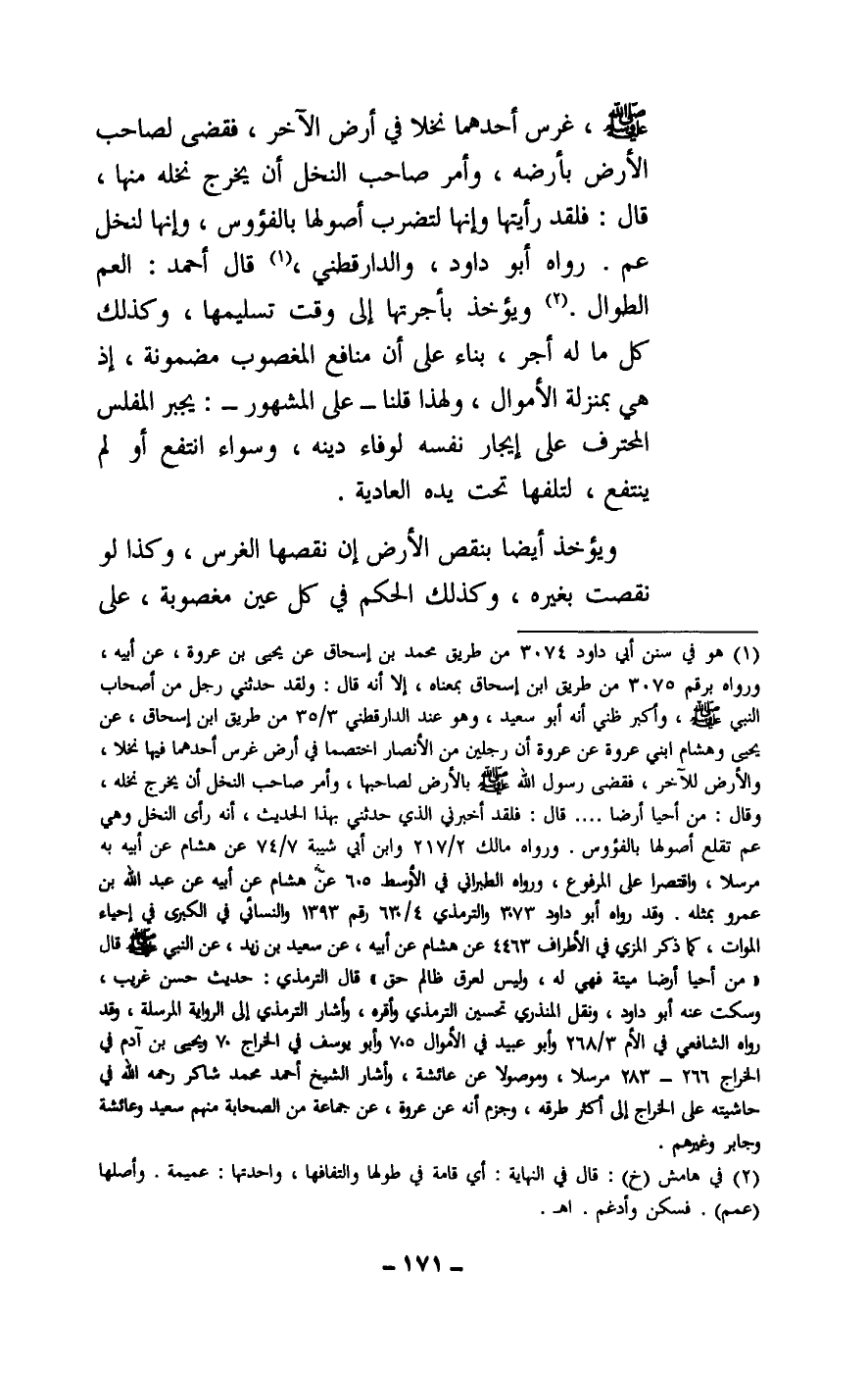 - صَلَّى اللَّهُ عَلَيْهِ وَسَلَّمَ -، غرس أحدهما نخلا في أرض الآخر، فقضى لصاحب الأرض بأرضه، وأمر صاحب النخل أن يخرج نخله منها، قال: فلقد رأيتها وإنها لتضرب أصولها بالفؤوس، وإنها لنخل عم» . رواه أبو داود، والدارقطني، قال أحمد: العم الطوال. ويؤخذ بأجرتها إلى وقت تسليمها، وكذلك كل ما له أجر، بناء على أن منافع المغصوب مضمونة، إذ هي بمنزلة الأموال؛ ولهذا قلنا - على المشهور -: يجبر المفلس المحترف على إيجار نفسه لوفاء دينه، وسواء انتفع أو لم ينتفع، لتلفها تحت يده العادية.