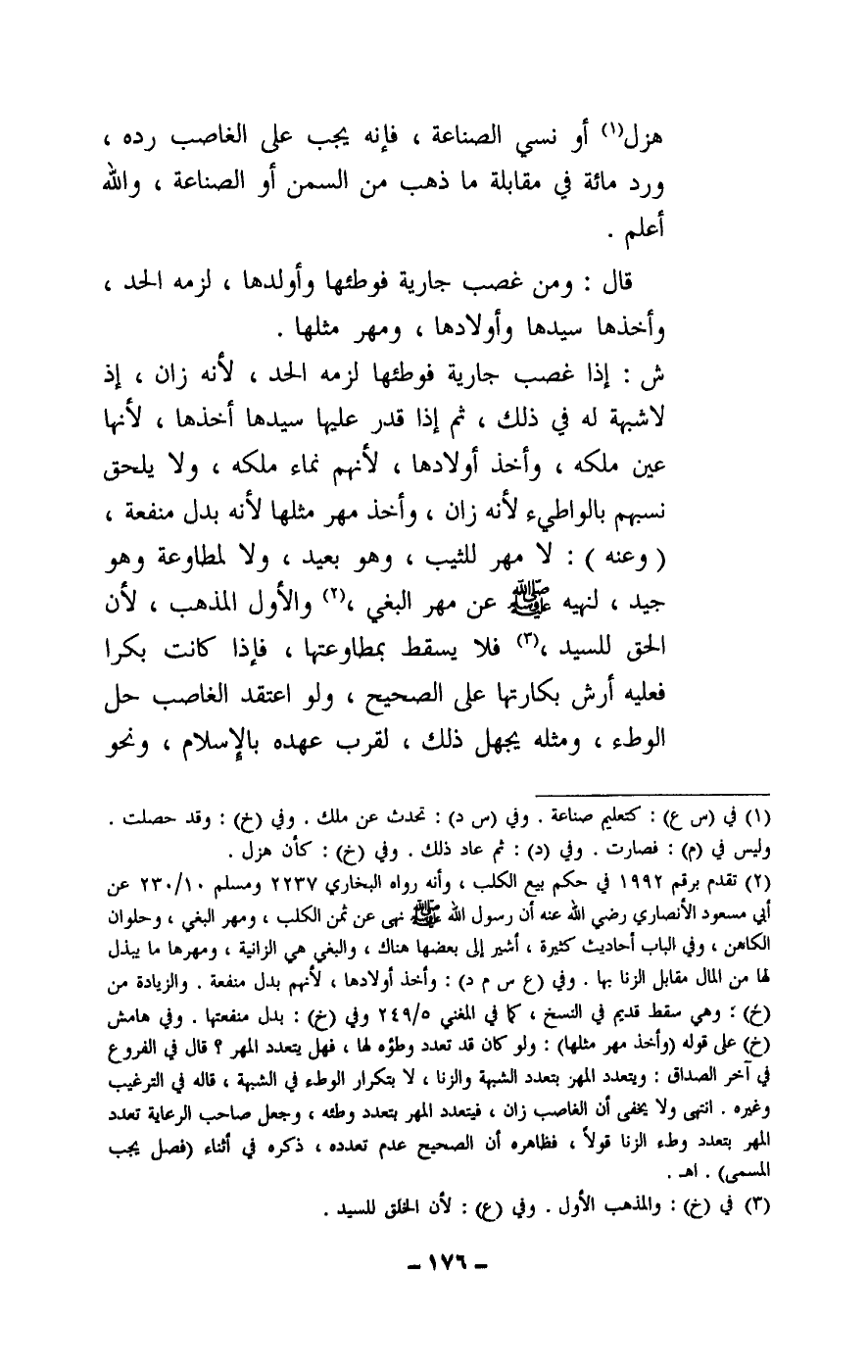 ش: إذا غصب جارية فوطئها لزمه الحد، لأنه زان، إذ لا شبهة له في ذلك، ثم إذا قدر عليها سيدها أخذها، لأنها عين ملكه، وأخذ أولادها، لأنهم نماء ملكه، ولا يلحق نسبهم بالواطئ لأنه زان، وأخذ مهر مثلها لأنه بدل منفعة.