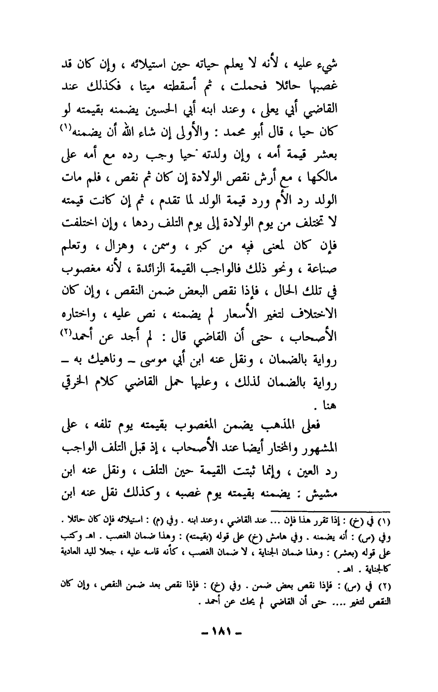 قال أبو محمد: والأولى إن شاء الله أن يضمنه بعشر قيمة أمه، وإن ولدته حيا وجب رده مع أمه على مالكها، مع أرش نقص الولادة إن كان ثم نقص، فلما مات الولد رد الأم ورد قيمة الولد لما تقدم، ثم إن كانت قيمته لا تختلف من يوم الولادة إلى يوم التلف ردها، وإن اختلفت فإن كان لمعنى فيه من كبر، وسمن، وهزال، وتعلم صناعة، ونحو ذلك؛ فالواجب القيمة الزائدة، لأنه مغصوب في تلك الحال، فإذا نقص البعض؛ ضمن النقص، وإن كان الاختلاف لتغير الأسعار؛ لم يضمنه، نص عليه، واختاره الأصحاب، حتى إن القاضي قال: لم أجد عن أحمد رواية بالضمان، ونقل عنه ابن أبي موسى - وناهيك به - رواية بالضمان لذلك، وعليها حمل القاضي كلام الخرقي هنا.