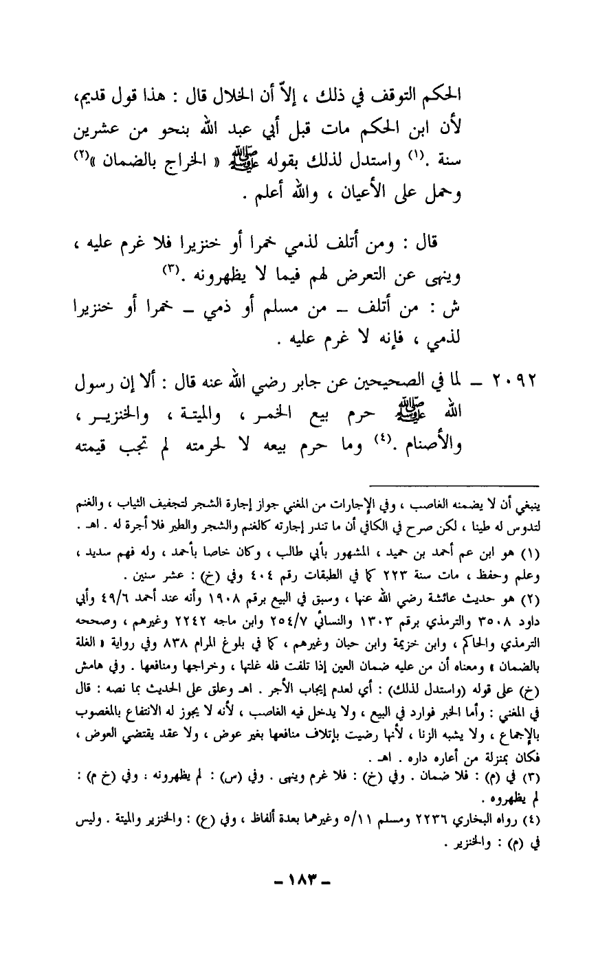 الحكم التوقف في ذلك، إلا أن الخلال قال: هذا قول قديم، لأن ابن الحكم مات قبل أبي عبد الله بنحو من عشرين سنة. واستدل لذلك بقوله - صَلَّى اللَّهُ عَلَيْهِ وَسَلَّمَ -: «الخراج بالضمان» وحمل على الأعيان، والله أعلم.