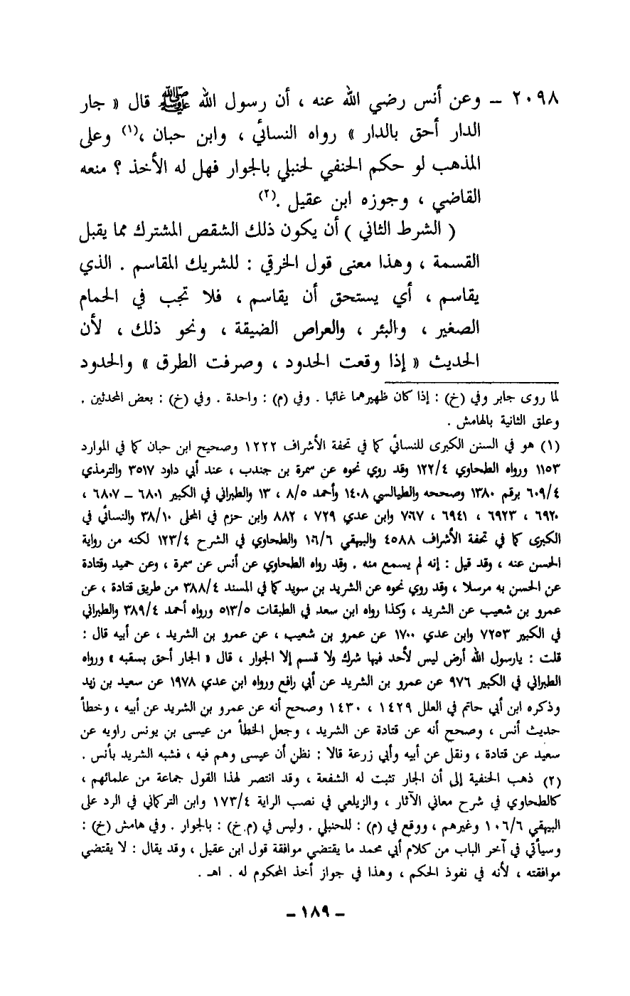 2098 - وعن أنس - رَضِيَ اللَّهُ عَنْهُ -، أن رسول الله - صَلَّى اللَّهُ عَلَيْهِ وَسَلَّمَ - قال: «جار الدار أحق بالدار» رواه النسائي، وابن حبان، وعلى المذهب لو حكم الحنفي لحنبلي بالجوار فهل له الأخذ؟ منعه القاضي، وجوزه ابن عقيل.