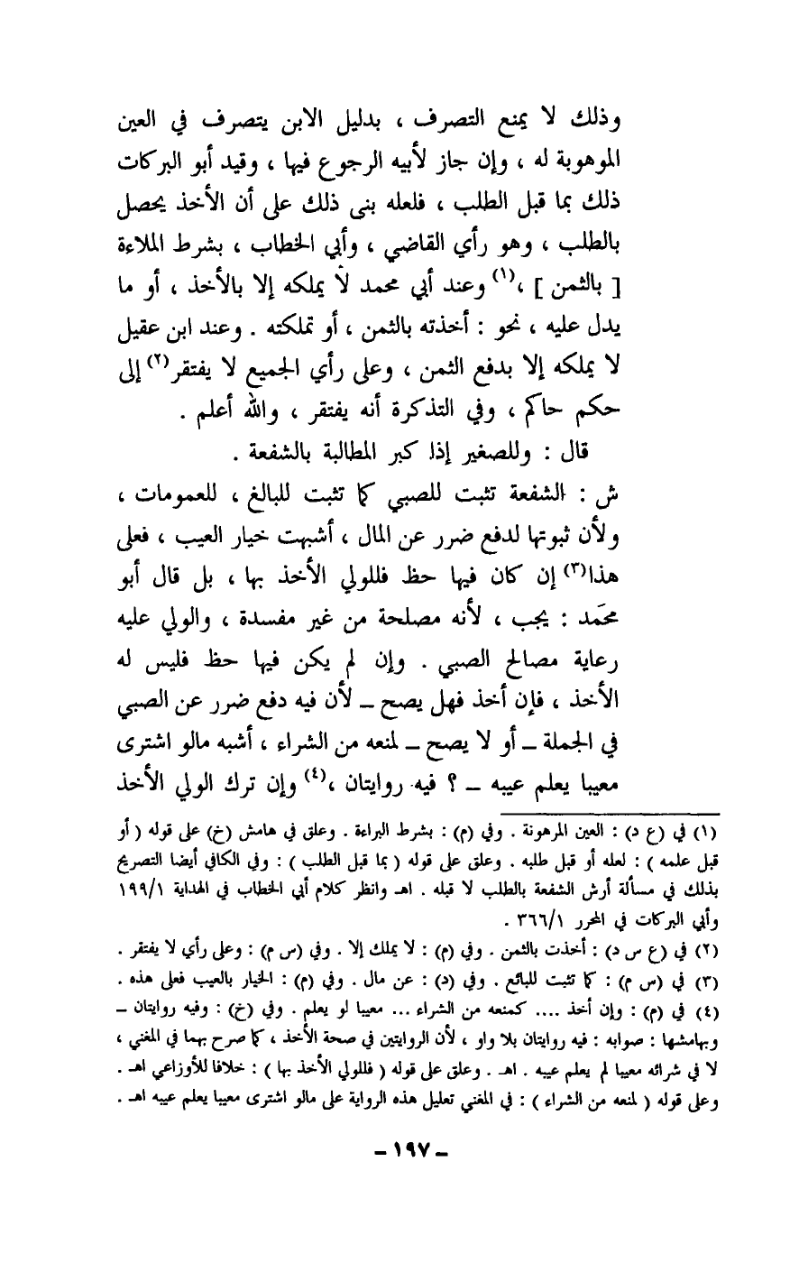 وذلك لا يمنع التصرف، بدليل الابن يتصرف في العين الموهوبة له، وإن جاز لأبيه الرجوع فيها، وقيد أبو البركات ذلك بما قبل الطلب، فلعله بنى ذلك على أن الأخذ يحصل بالطلب، وهو رأي القاضي، وأبي الخطاب، بشرط الملاءة [بالثمن] ، وعند أبي محمد لا يملكه إلا بالأخذ، أو ما يدل عليه، نحو: أخذته بالثمن، أو تملكته. وعند ابن عقيل لا يملكه إلا بدفع الثمن، وعلى رأي الجميع لا يفتقر إلى حكم حاكم، وفي التذكرة أنه يفتقر، والله أعلم.