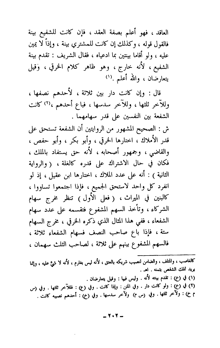 ش: الصحيح المشهور من الروايتين أن الشفعة تستحق على قدر الأملاك، اختاره الخرقي، وأبو بكر، وأبو حفص، والقاضي، وجمهور أصحابه، لأنه حق يستفاد بالملك، فكان في حال الاشتراك على قدره كالغلة.