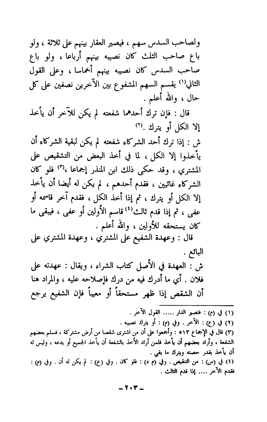ولصاحب السدس سهم، فيصير العقار بينهم على ثلاثة، ولو باع صاحب الثلث كان نصيبه بينهم أرباعا، ولو باع صاحب السدس كان نصيبه بينهم أخماسا، وعلى القول الثاني يقسم السهم المشفوع بين الآخرين نصفين على كل حال، والله أعلم.
