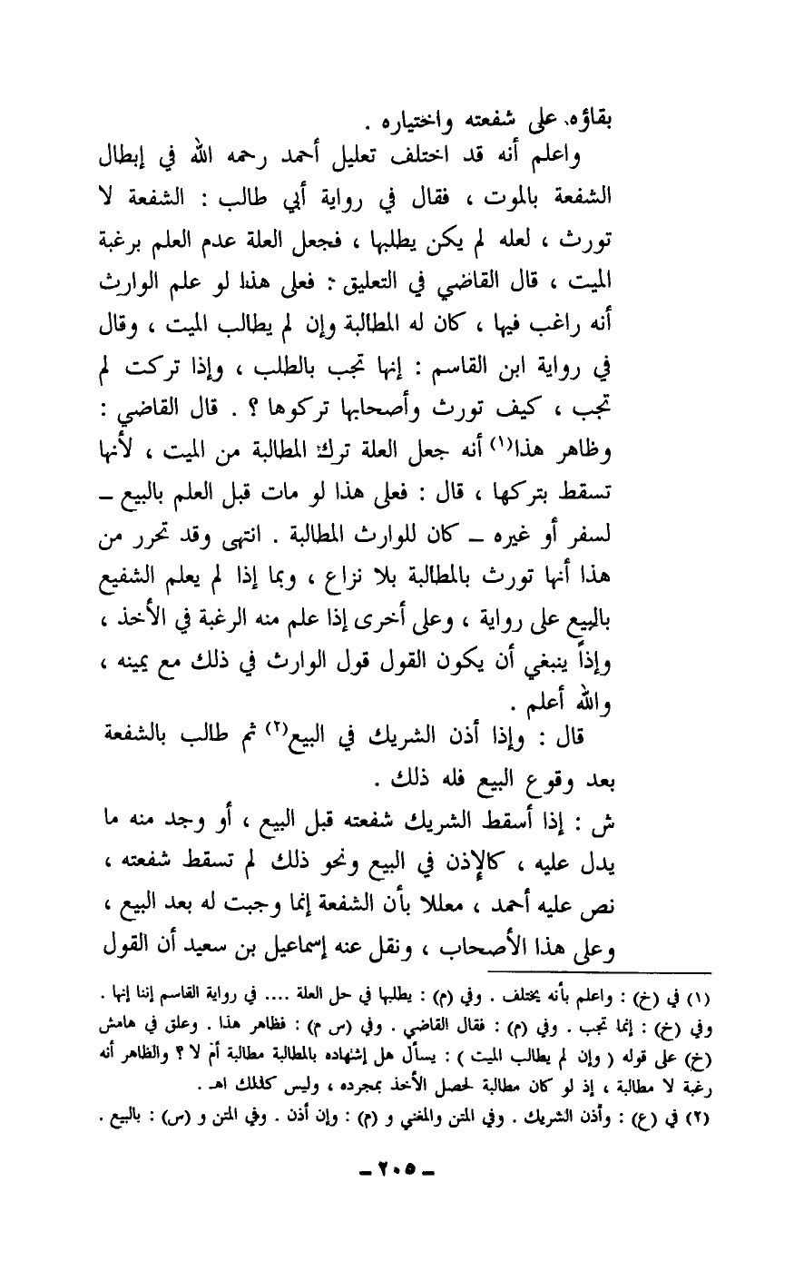 واعلم أنه قد اختلف تعليل أحمد - رَحِمَهُ اللَّهُ - في إبطال الشفعة بالموت، فقال في رواية أبي طالب: الشفعة لا تورث، لعله لم يكن يطلبها، فجعل العلة عدم العلم برغبة الميت، قال القاضي في التعليق. فعلى هذا لو علم الوارث أنه راغب فيها، كان له المطالبة وإن لم يطالب الميت، وقال في رواية ابن القاسم: إنها تجب بالطلب، وإذا تركت لم تجب، كيف تورث وأصحابها تركوها؟ ، قال القاضي: وظاهر هذا أنه جعل العلة ترك المطالبة من الميت، لأنها تسقط بتركها، قال: فعلى هذا لو مات قبل العلم بالبيع - لسفر أو غيره - كان للوارث المطالبة. انتهى وقد تحرر من هذا أنها تورث بالمطالبة بلا نزاع، وبما إذا لم يعلم الشفيع بالبيع على رواية، وعلى أخرى إذا علم منه الرغبة في الأخذ، وإذا ينبغي أن يكون القول قول الوارث في ذلك مع يمينه، والله أعلم.