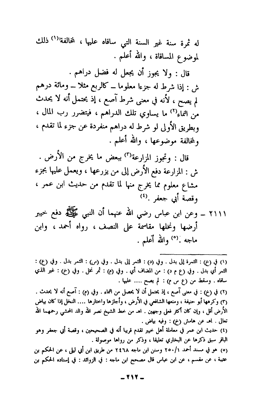 2111 - وعن ابن عباس - رَضِيَ اللَّهُ عَنْهُمَا - «أن النبي - صَلَّى اللَّهُ عَلَيْهِ وَسَلَّمَ - دفع خيبر أرضها ونخلها مقاسمة على النصف» ، رواه أحمد، وابن ماجه. والله أعلم.