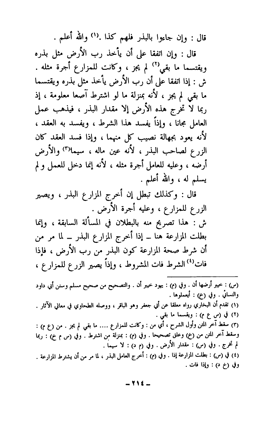 ش: هذا تصريح منه بالبطلان في المسألة السابقة، وإنما بطلت المزارعة هنا - إذا أخرج المزارع البذر - لما مر من أن شرط صحة المزارعة كون البذر من رب الأرض، فإذا فات الشرط؛ فات المشروط، وإذا يصير الزرع للمزارع،