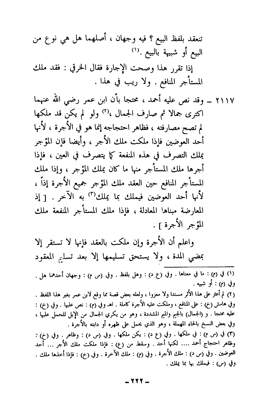 2117 - وقد نص عليه أحمد، محتجا بأن ابن عمر - رَضِيَ اللَّهُ عَنْهُمَا - اكترى جمالا ثم صارف الجمال، ولو لم يكن قد ملكها لم تصح مصارفته، فظاهر احتجاجه إنما هو في الأجرة، لأنها أحد العوضين، فإذا ملكت ملك الأجر، وأيضا فإن المؤجر يملك التصرف في هذه المنفعة كما يتصرف في العين، فإذا أجرها ملك المستأجر منها ما كان يملك المؤجر، وإذا ملك المستأجر المنافع حين العقد ملك المؤجر جميع الأجرة إذا، لأنها أحد العوضين فيملك بما يملك به الآخر. [إذ المعارضة مبناها المعادلة، فإذا ملك المستأجر المنفعة ملك المؤجر الأجرة] .