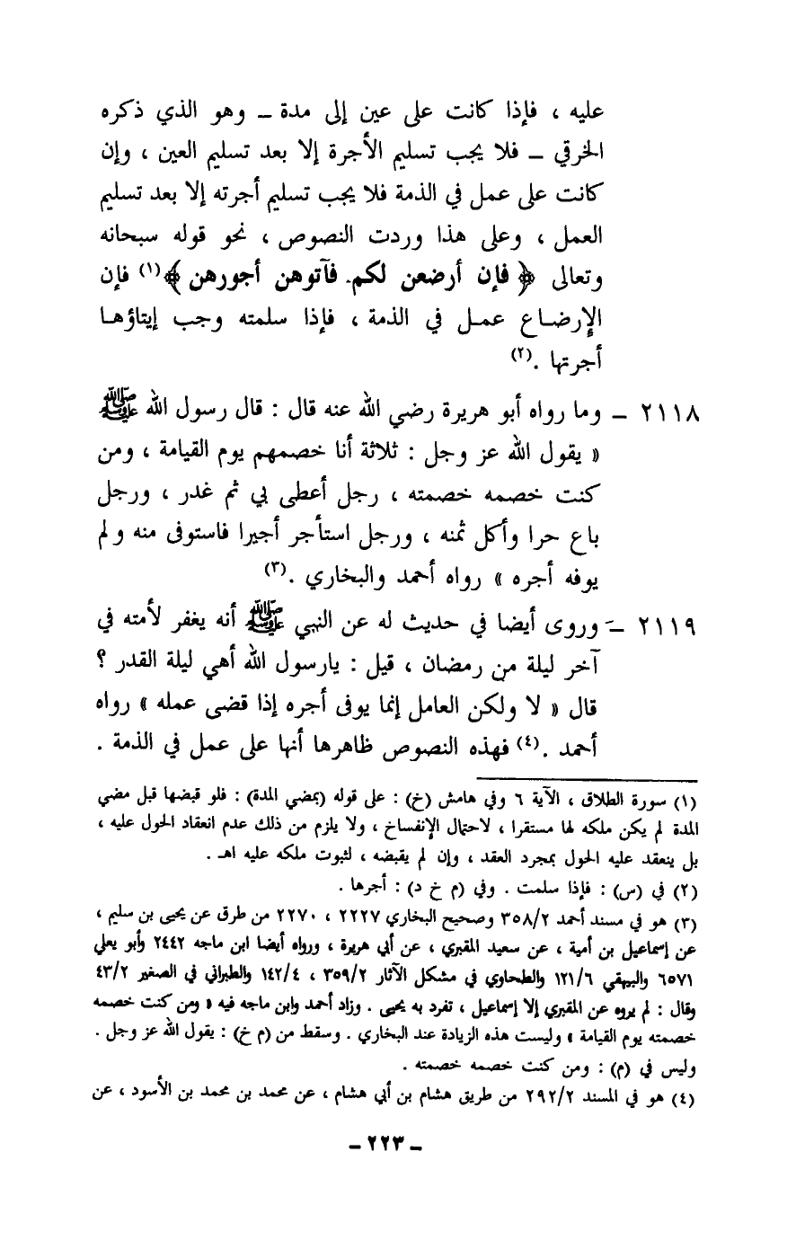 2118 - وما رواه أبو هريرة - رَضِيَ اللَّهُ عَنْهُ - قال: قال رسول الله - صَلَّى اللَّهُ عَلَيْهِ وَسَلَّمَ -: «يقول الله عز وجل: ثلاثة أنا خصمهم يوم القيامة، ومن كنت خصمه خصمته؛ رجل أعطى بي ثم غدر، ورجل باع حرا وأكل ثمنه، ورجل استأجر أجيرا فاستوفى منه ولم يوفه أجره» . رواه أحمد والبخاري.