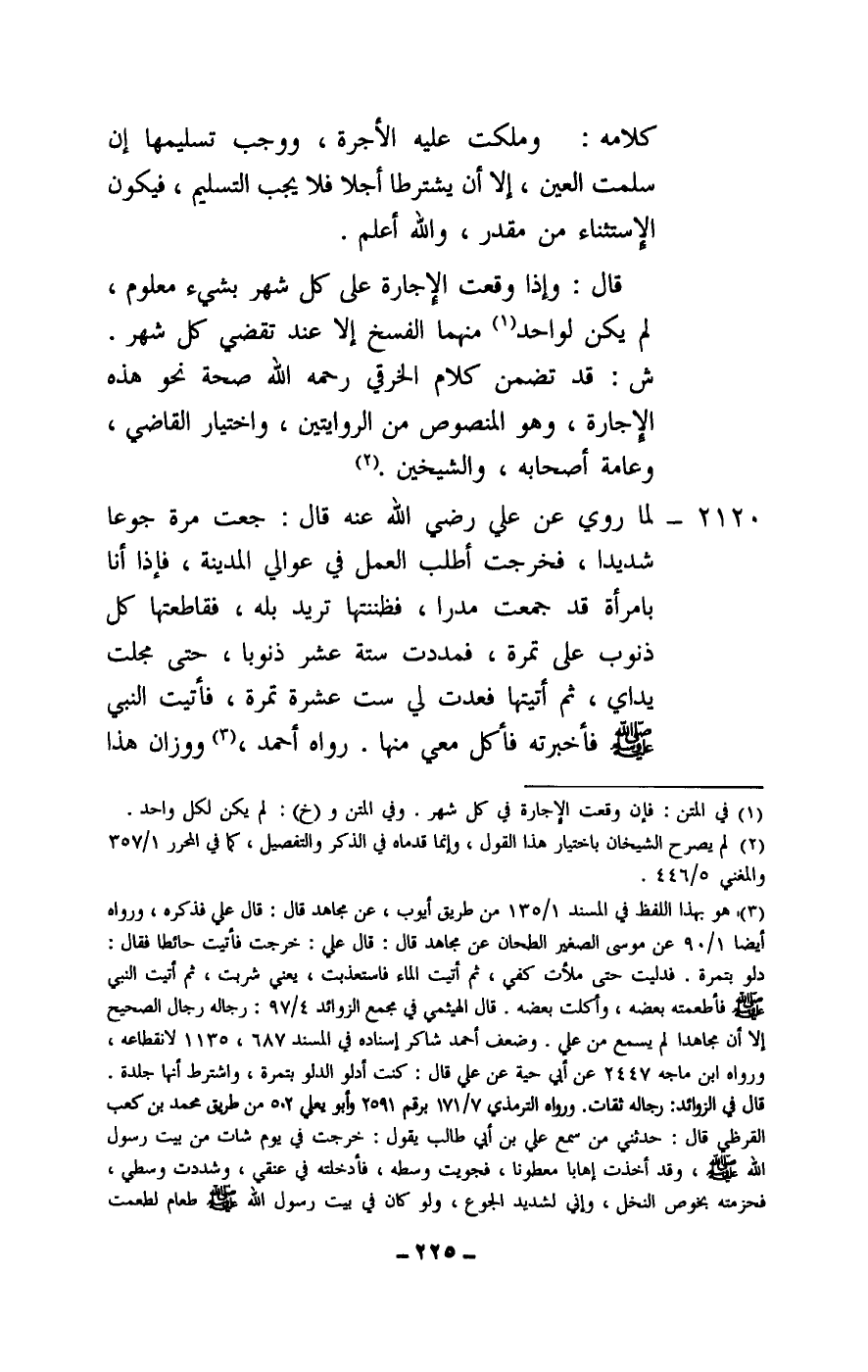 2120 - لما روي عن علي - رَضِيَ اللَّهُ عَنْهُ - قال: جعت مرة جوعا شديدا، فخرجت أطلب العمل في عوالي المدينة، فإذا أنا بامرأة قد جمعت مدرا، فظننتها تريد بله، فقاطعتها كل ذنوب على تمرة، فمددت ستة عشر ذنوبا، حتى مجلت يداي، ثم أتيتها فعدت لي ست عشرة تمرة، فأتيت النبي - صَلَّى اللَّهُ عَلَيْهِ وَسَلَّمَ - فأخبرته فأكل معي منها. رواه أحمد، ووزان هذا
