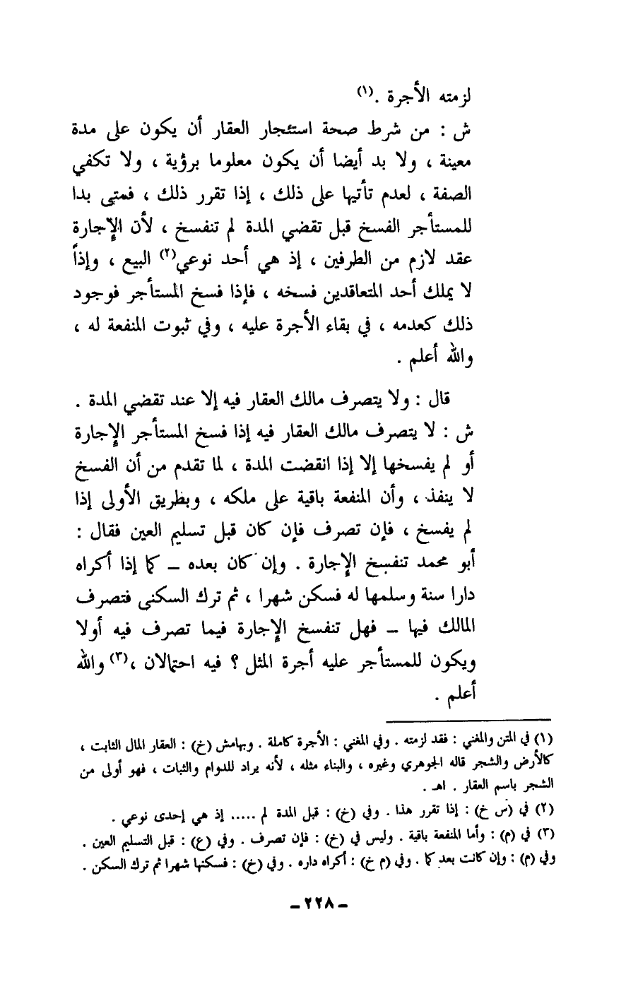 ش: من شرط صحة استئجار العقار أن يكون على مدة معينة، ولا بد أيضا أن يكون معلوما برؤية، ولا تكفي الصفة، لعدم تأتيها على ذلك، إذا تقرر ذلك، فمتى بدا للمستأجر الفسخ قبل تقضي المدة لم تنفسخ، لأن الإجارة عقد لازم من الطرفين، إذ هي أحد نوعي البيع، وإذا لا يملك أحد المتعاقدين فسخه، فإذا فسخ المستأجر فوجود ذلك كعدمه، في بقاء الأجرة عليه، وفي ثبوت المنفعة له، والله أعلم.