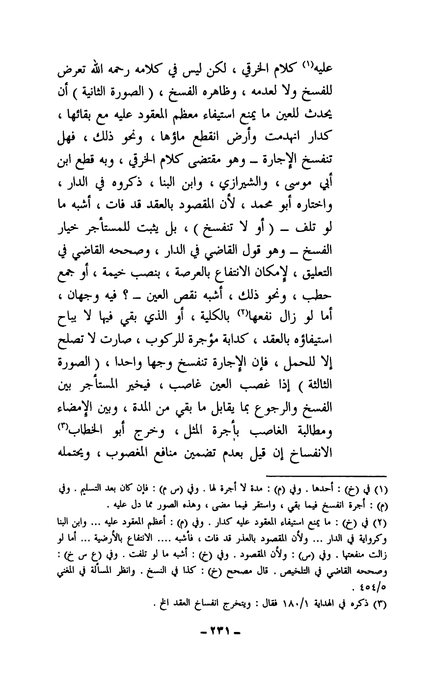(الصورة الثانية) : أن يحدث للعين ما يمنع استيفاء معظم المعقود عليه مع بقائها، كدار انهدمت وأرض انقطع ماؤها، ونحو ذلك، فهل تنفسخ الإجارة - وهو مقتضى كلام الخرقي، وبه قطع ابن أبي موسى، والشيرازي، وابن البنا، ذكروه في الدار، واختاره أبو محمد، لأن المقصود بالعقد قد فات، أشبه ما لو تلف - (أو لا تنفسخ) ، بل يثبت للمستأجر خيار الفسخ - وهو قول القاضي في الدار، وصححه القاضي في التعليق، لإمكان الانتفاع بالعرصة، بنصب خيمة، أو جمع حطب، ونحو ذلك، أشبه نقص العين؟ فيه وجهان، أما لو زال نفعها بالكلية، أو الذي بقي فيها لا يباح استيفاؤه بالعقد، كدابة مؤجرة للركوب، صارت لا تصلح إلا للحمل، فإن الإجارة تنفسخ وجها واحدا.