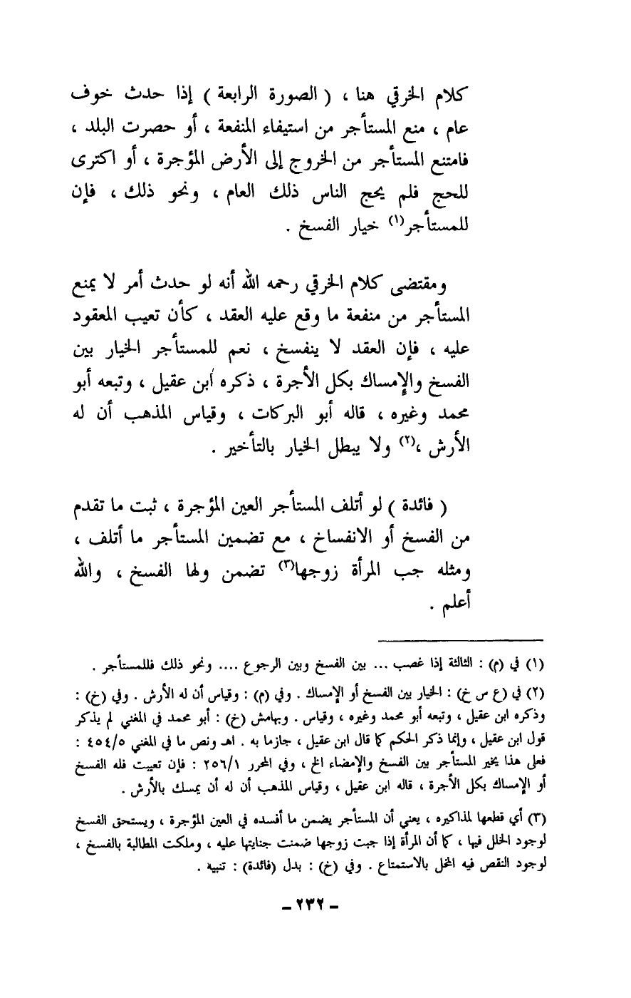 ومقتضى كلام الخرقي - رَحِمَهُ اللَّهُ -: أنه لو حدث أمر لا يمنع المستأجر من منفعة ما وقع عليه العقد، كأن تعيب المعقود عليه، فإن العقد لا ينفسخ، نعم للمستأجر الخيار بين الفسخ والإمساك بكل الأجرة، ذكره ابن عقيل، وتبعه أبو محمد وغيره، قاله أبو البركات، وقياس المذهب أن له الأرش، ولا يبطل الخيار بالتأخير.